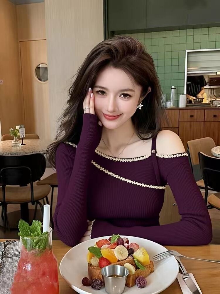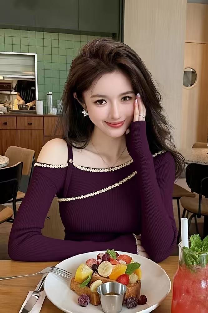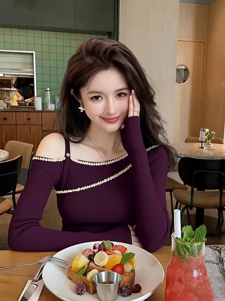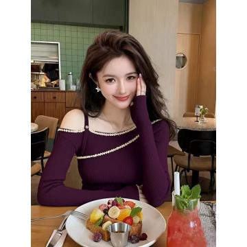 FA53063# 不规则斜肩露肩针织打底衫女秋冬新款内搭好看修身长袖上衣女 服裝批發女裝批發服飾貨源