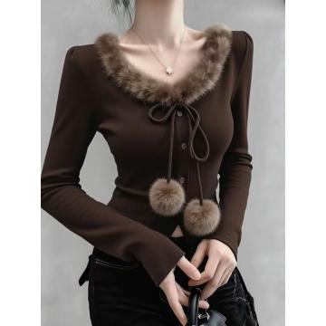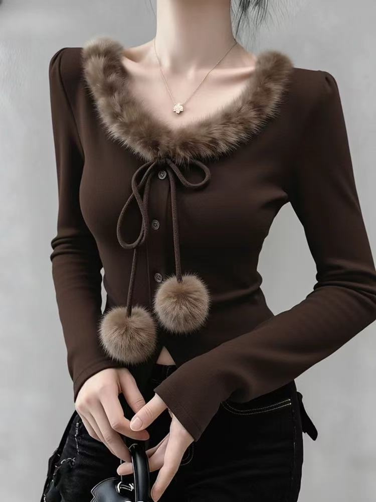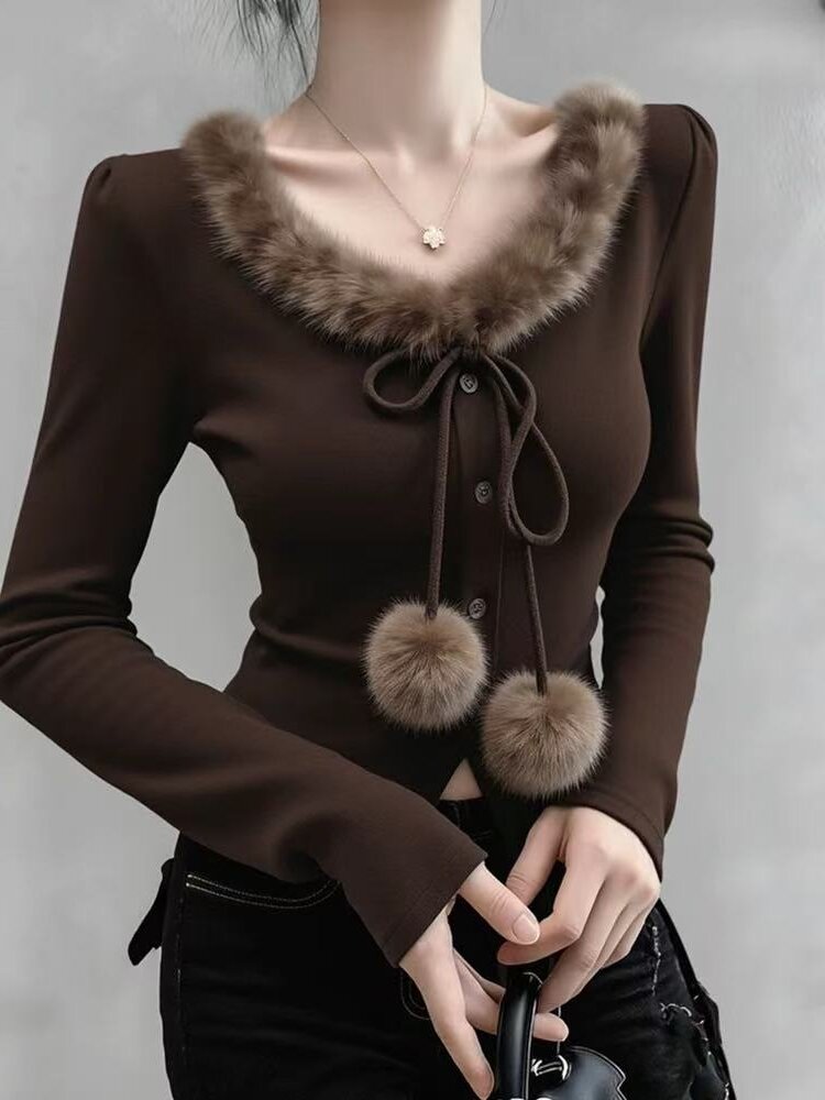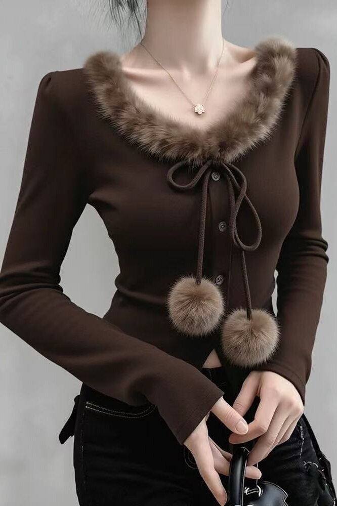FA53064# 系带毛毛边长袖针织衫女秋冬收腰套头黑色打底衫上衣女 服裝批發女裝批發服飾貨源