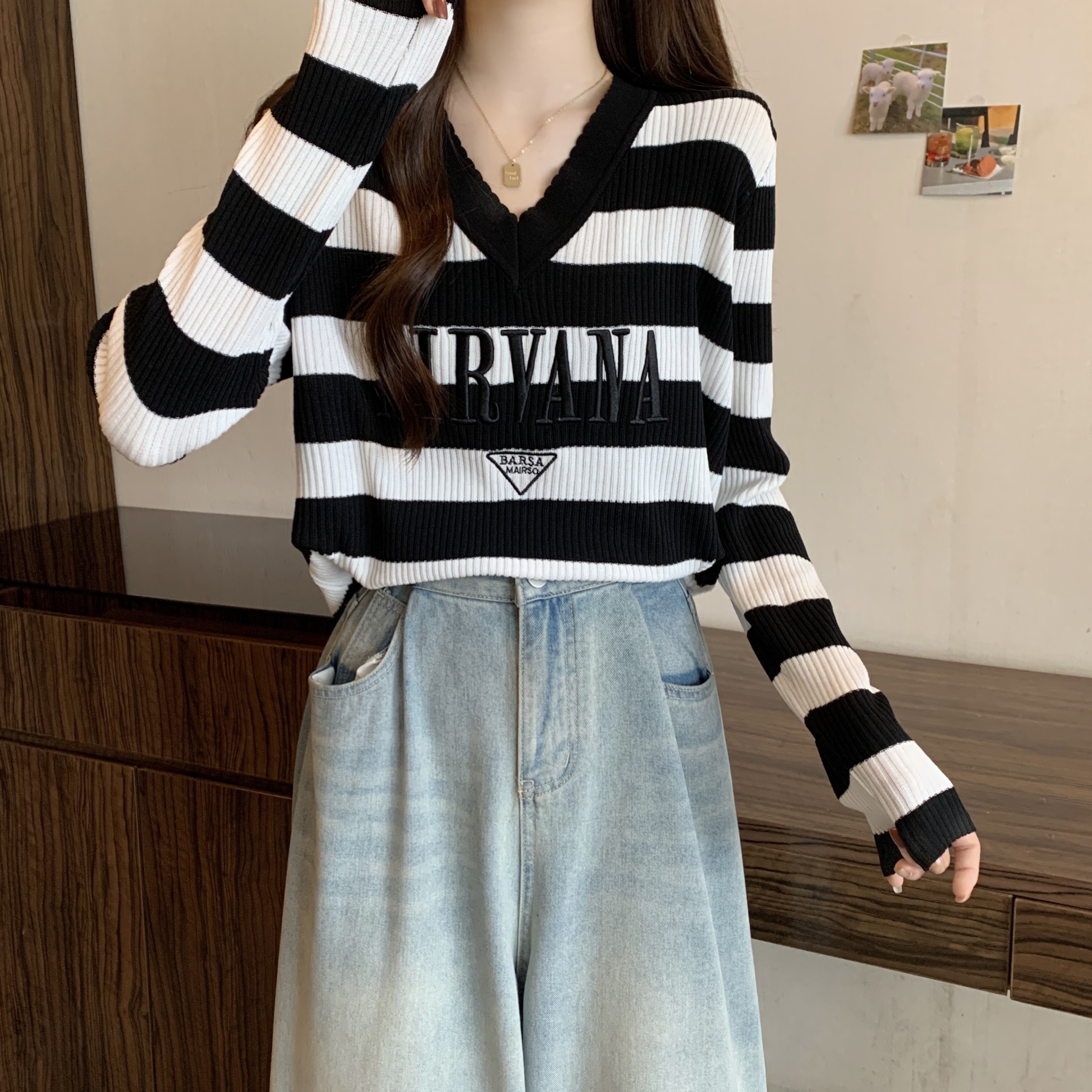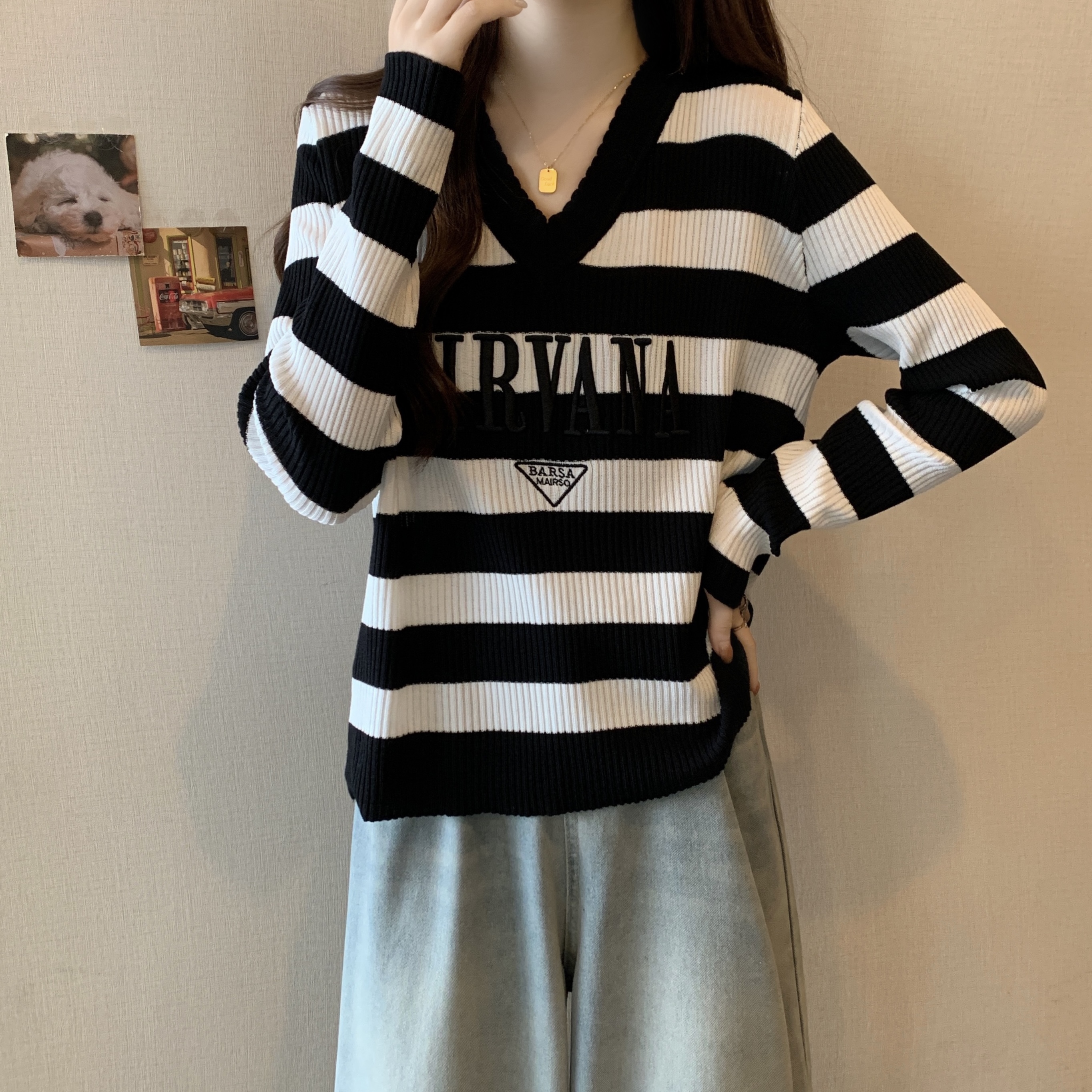 FA53125# 大码女装早春新款V领字母刺绣条纹长袖薄款针织衫 服裝批發女裝批發服飾貨源