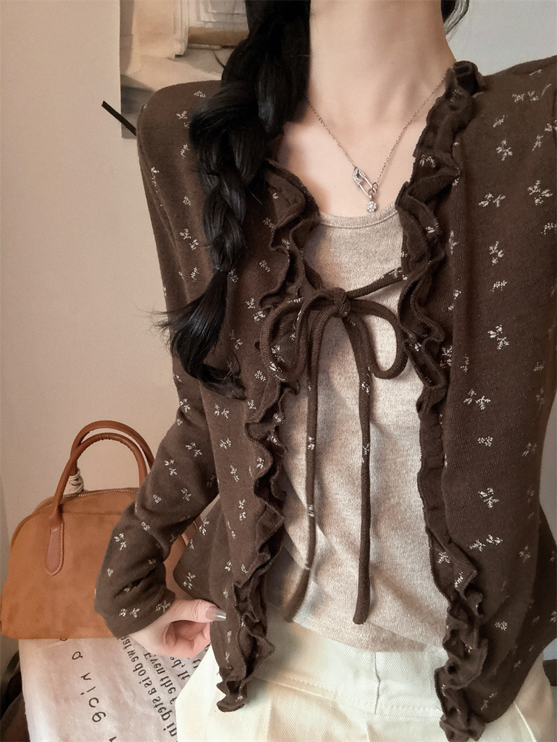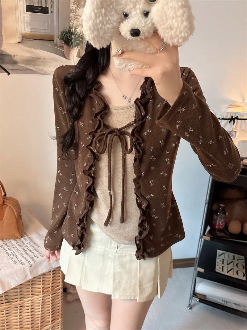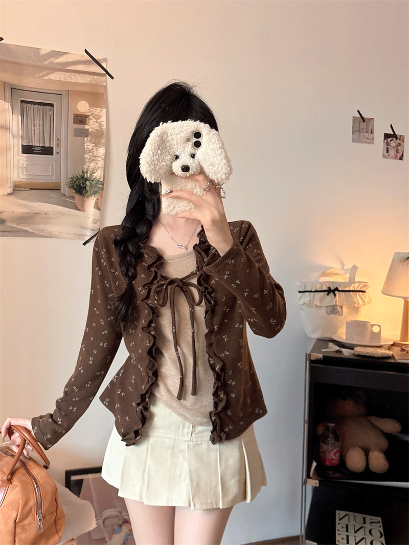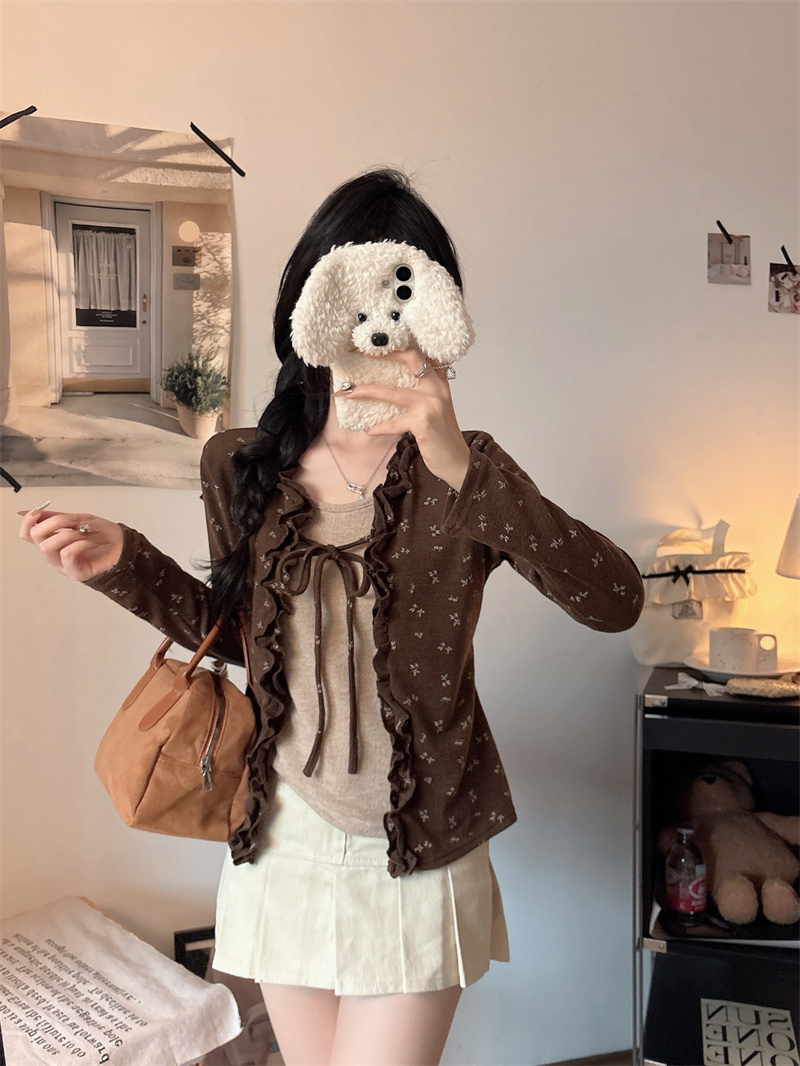 FA53134# 大码设计感气质碎花拼色假两件长袖荷叶边系带打底衫 服裝批發女裝批發服飾貨源