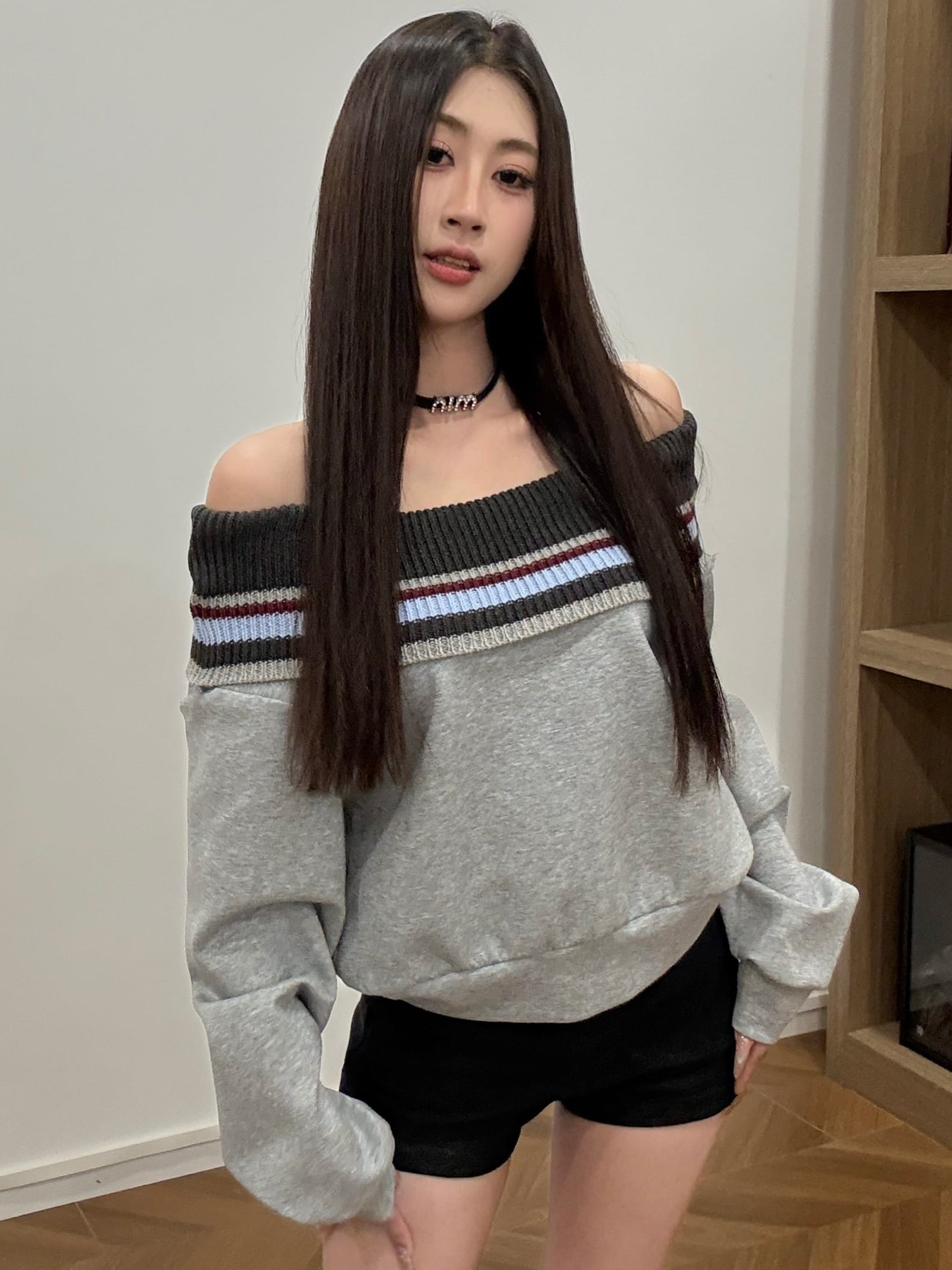 FA53660# 春季新款设计感条纹一字领针织拼接卫衣宽松上衣外套