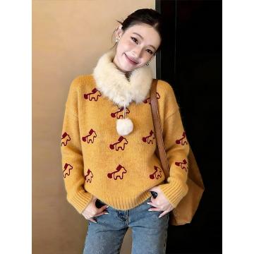 FA54514# 黄色毛领小马提花针织衫毛衣女冬季新款设计感超好看套头上衣 服裝批發女裝批發服飾貨源