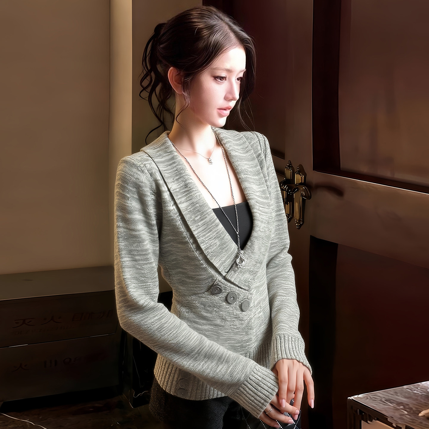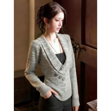 FA54516# 灰色假两件正肩低领针织衫秋冬季新款上班通勤气质毛衣上衣女 服裝批發女裝批發服飾貨源