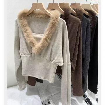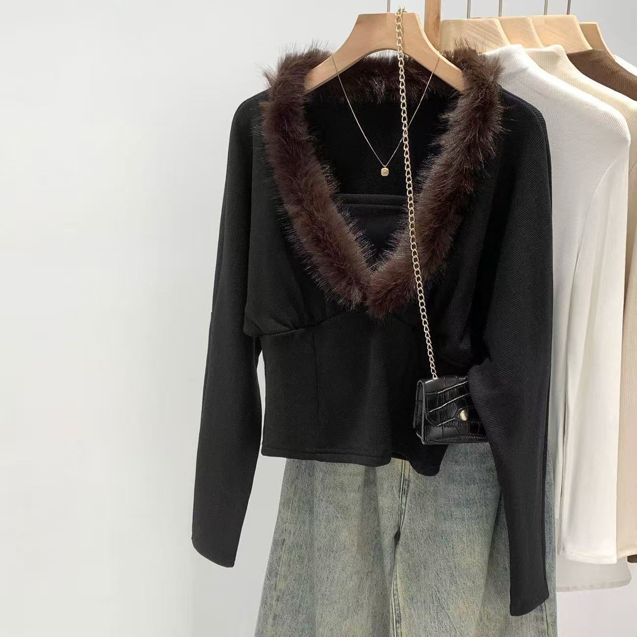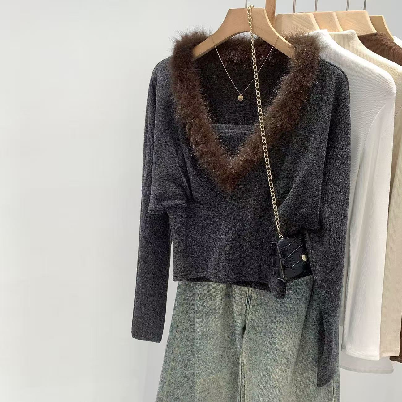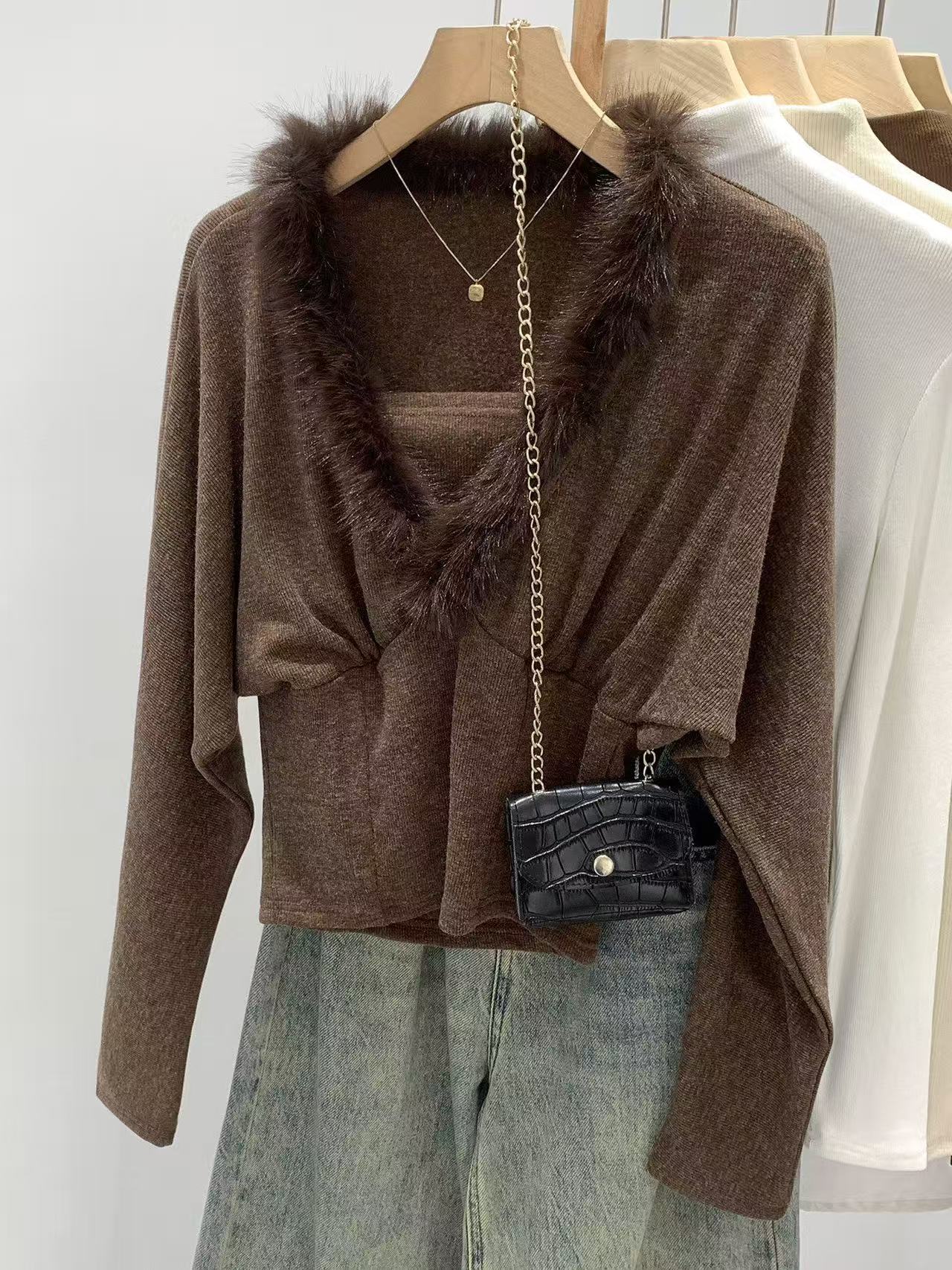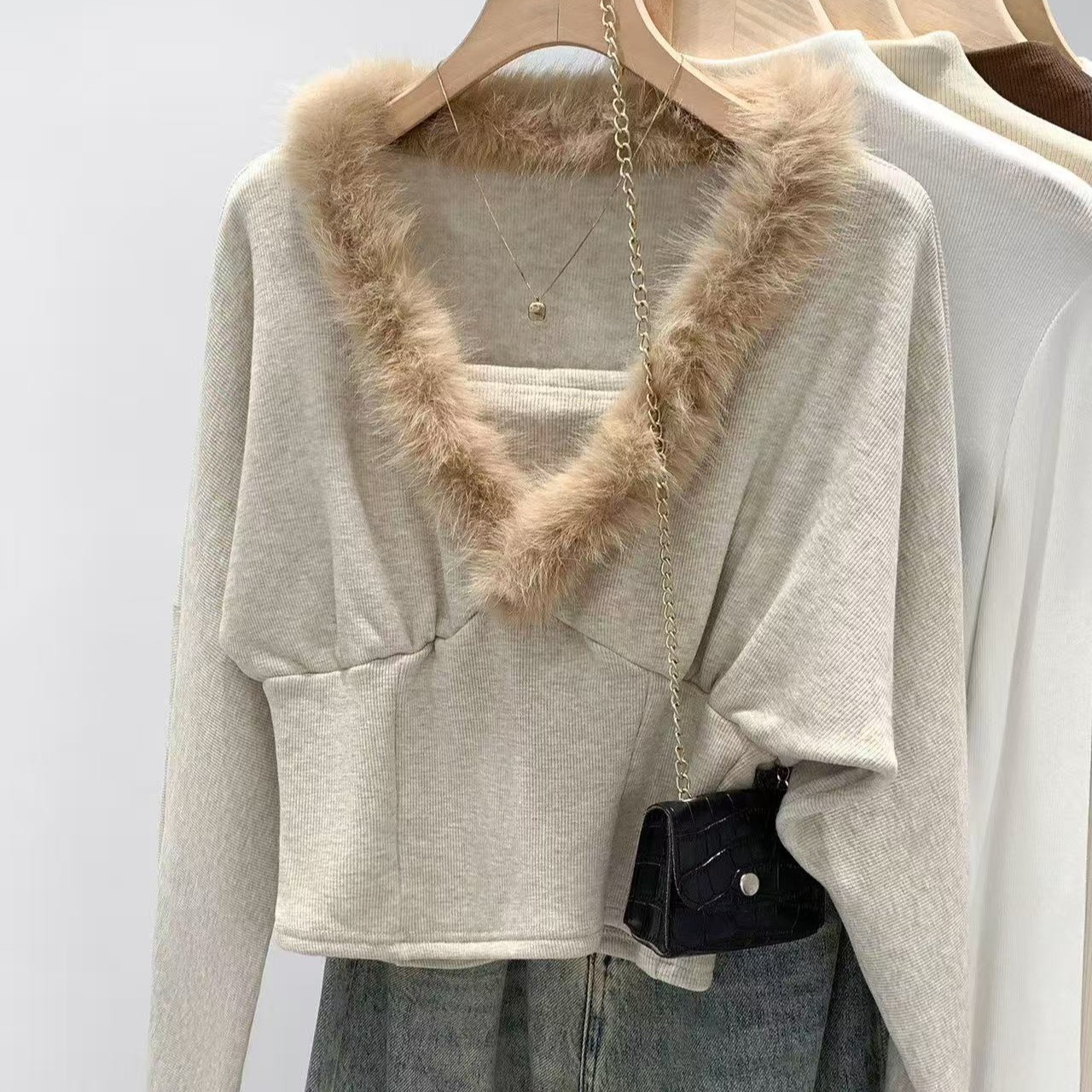 FA56107# 小个子假两件设计感毛毛V领短款打底衫女春新款内搭纯色上衣 服裝批發女裝批發服飾貨源