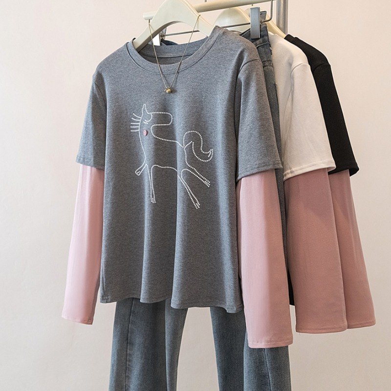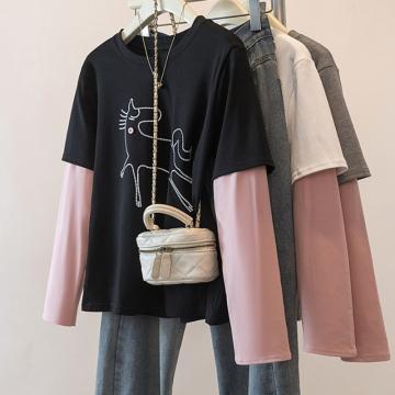 FA56144# 大码假两件T恤女春季新款复古设计感拼接t恤百搭减龄上衣 服裝批發女裝批發服飾貨源