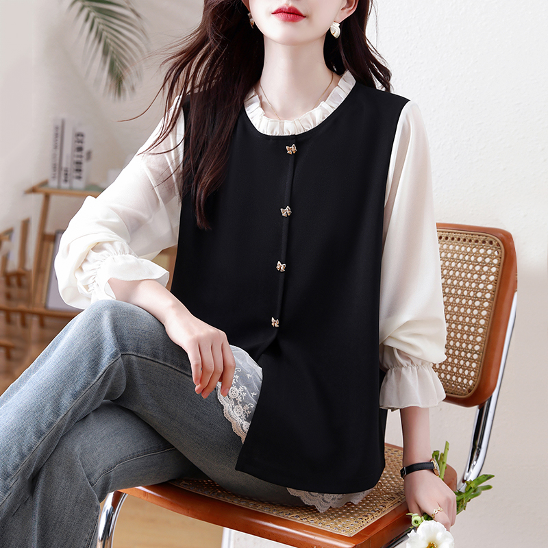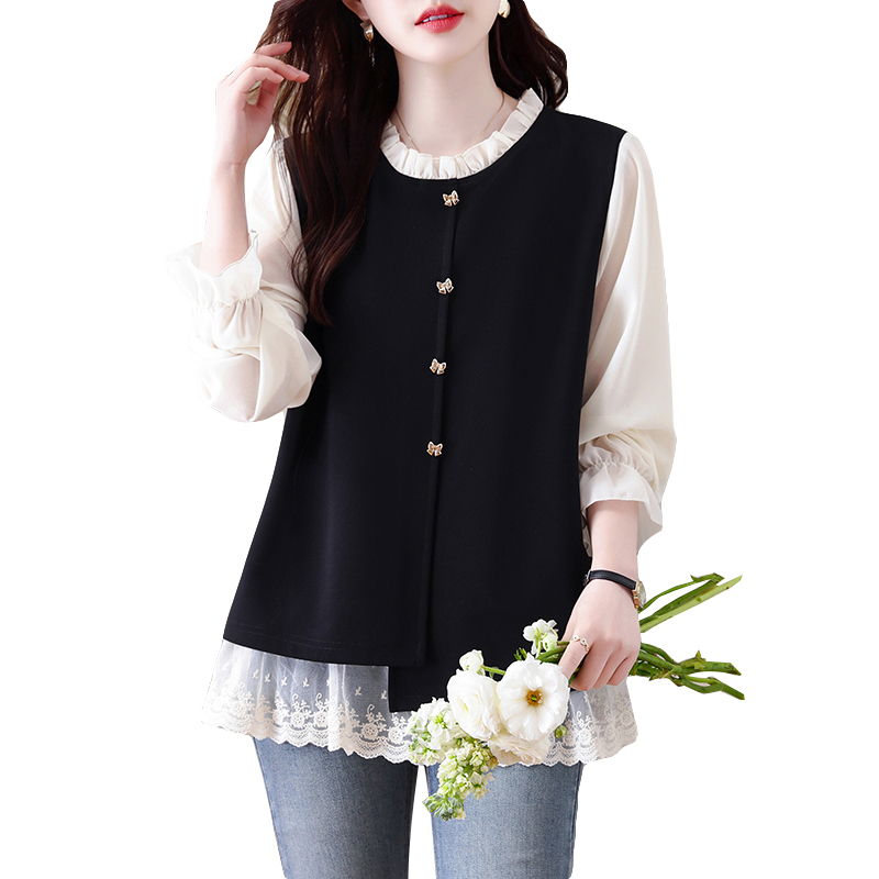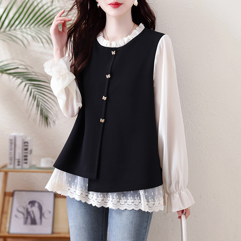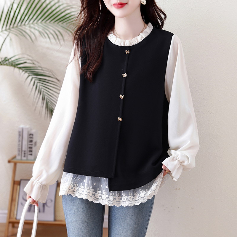 FA56152# 假两件大码女装春季新款网纱拼接法式上衣女 服裝批發女裝批發服飾貨源