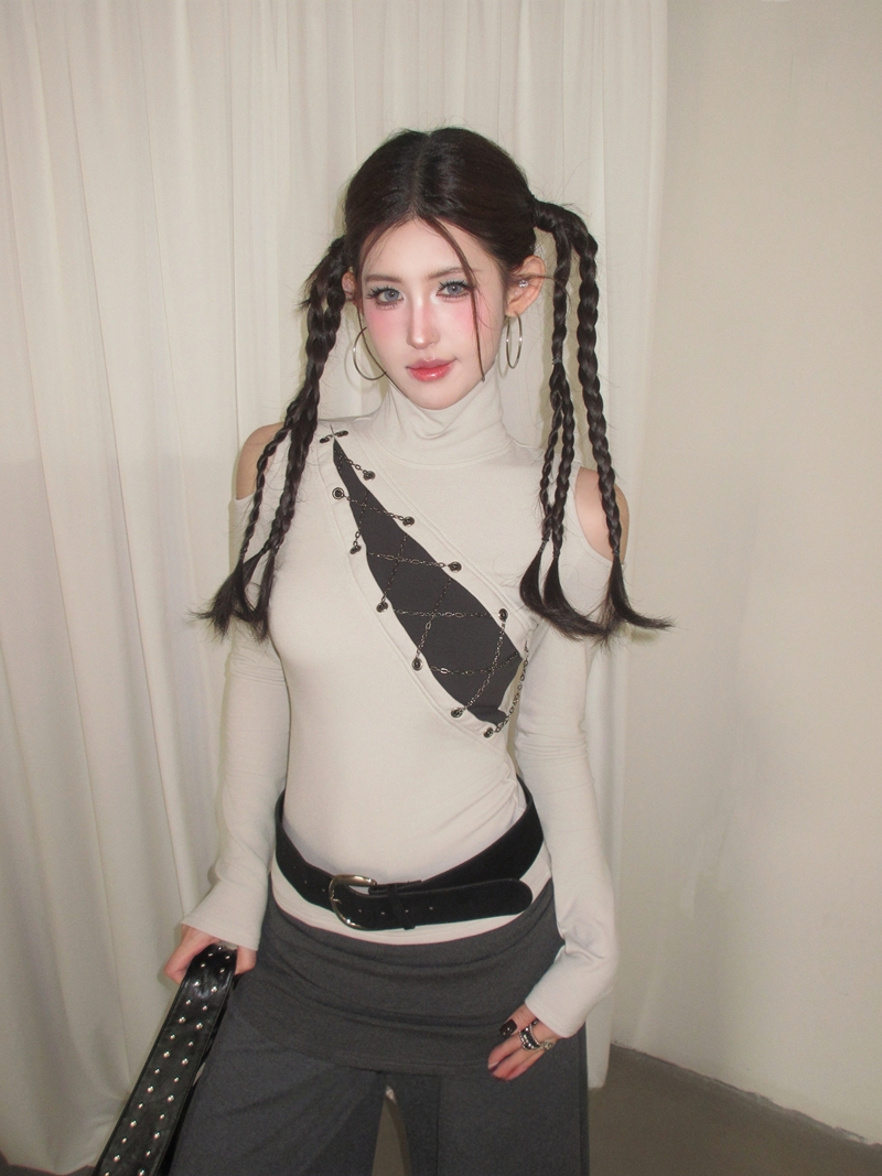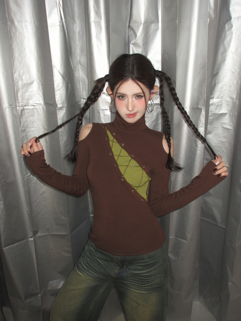 Home > 长袖T恤 > FA56643# 复古辣妹高领拼接流苏镂空露肩修身显瘦磨毛内搭打底衫 服裝批發女裝批發服飾貨源