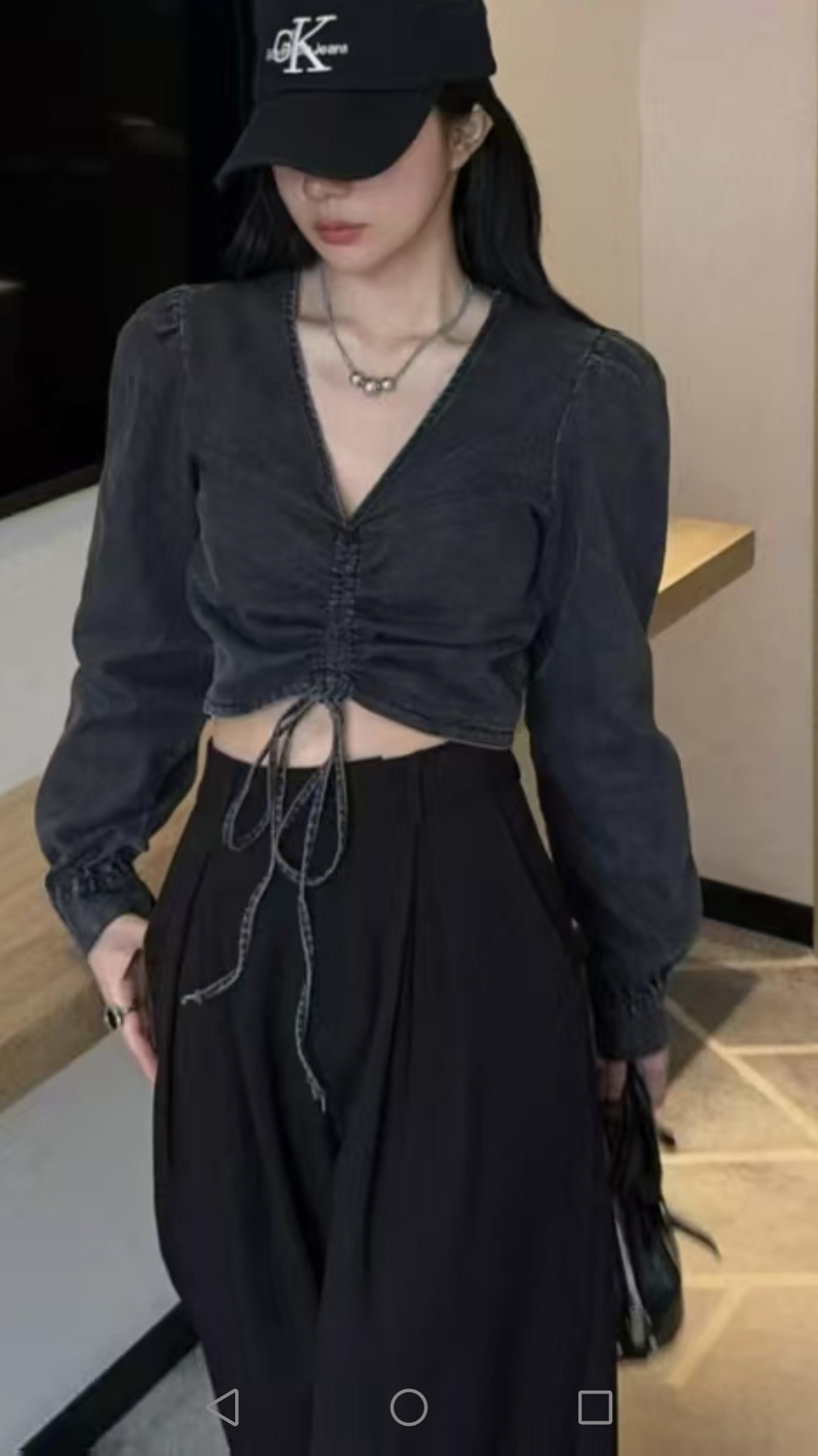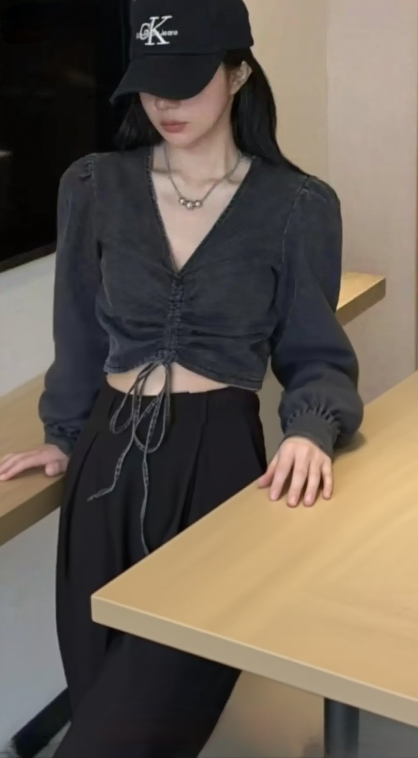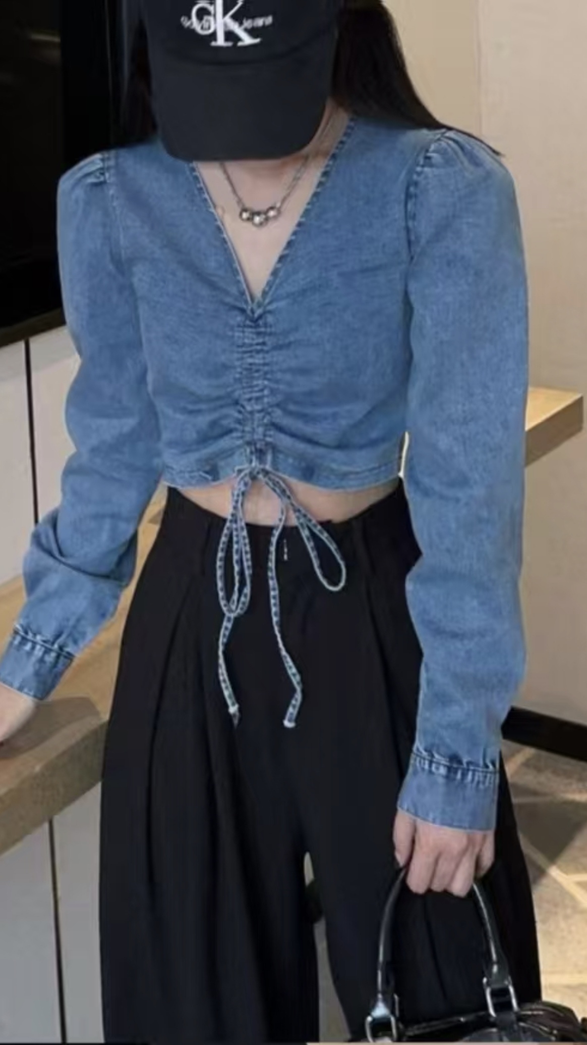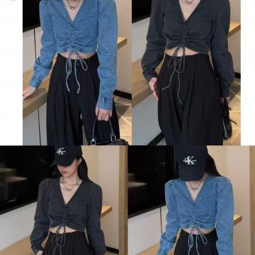 FA56651# 新款韩版欧美风性感V领抽绳侧边拉链泡泡长袖短款牛仔衬衫上衣 服裝批發女裝批發服飾貨源