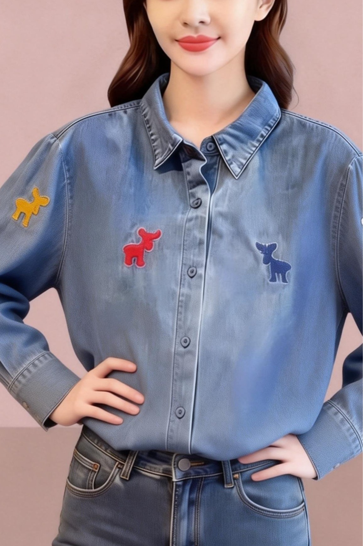 FA56653# 韩版彩色糜鹿刺绣早春简约宽松百搭叠穿牛仔上衣 服裝批發女裝批發服飾貨源