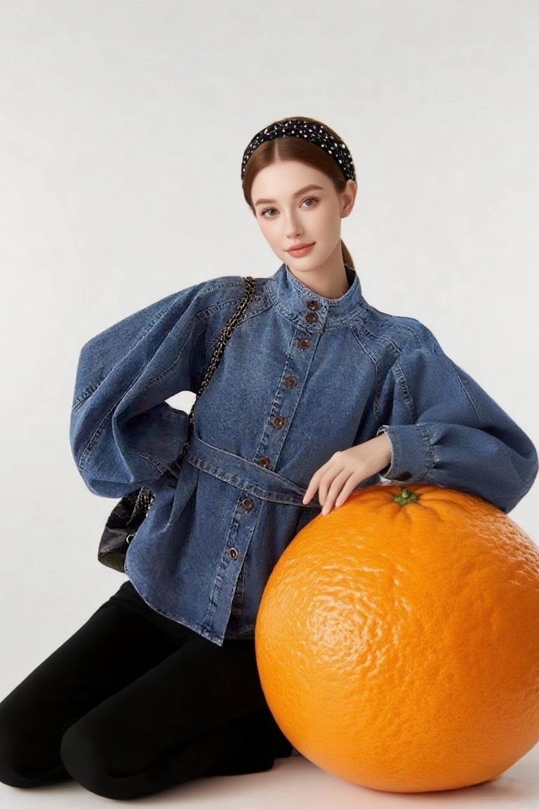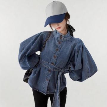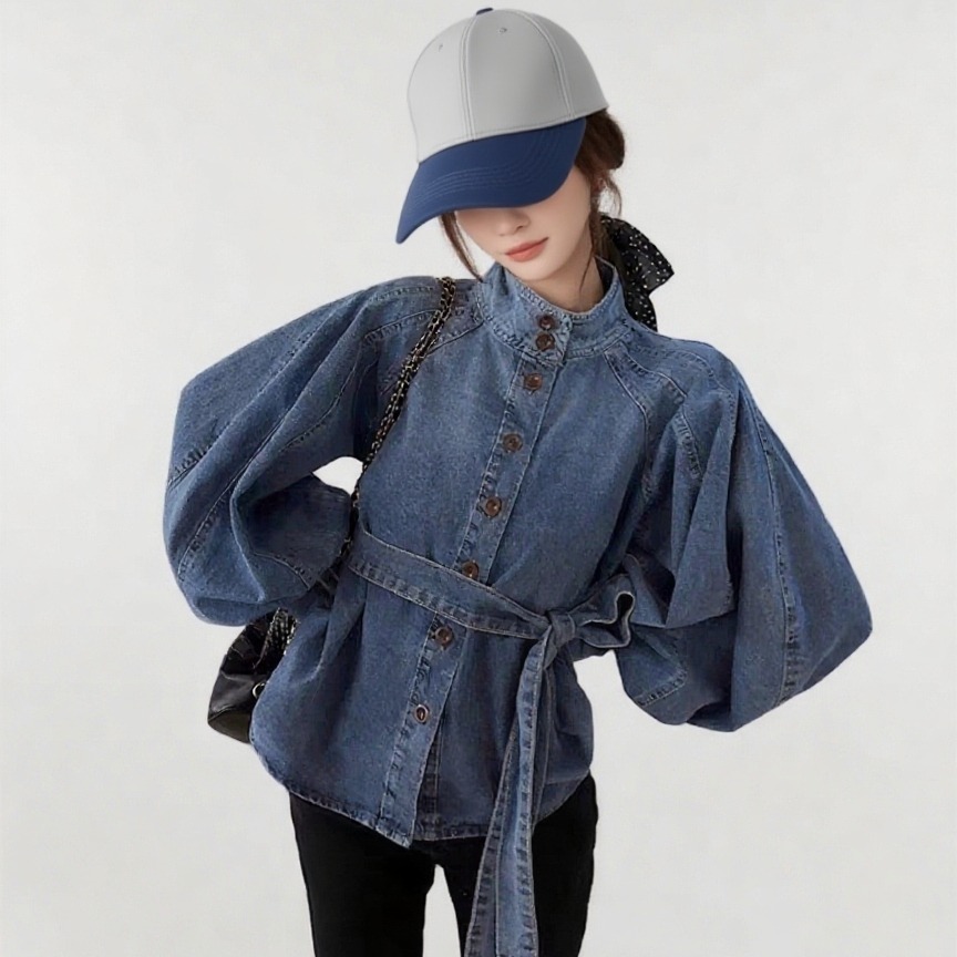 FA56655# 春季新款港味复古轻奢绑带收腰立领灯笼袖显瘦百搭牛仔上衣 服裝批發女裝批發服飾貨源
