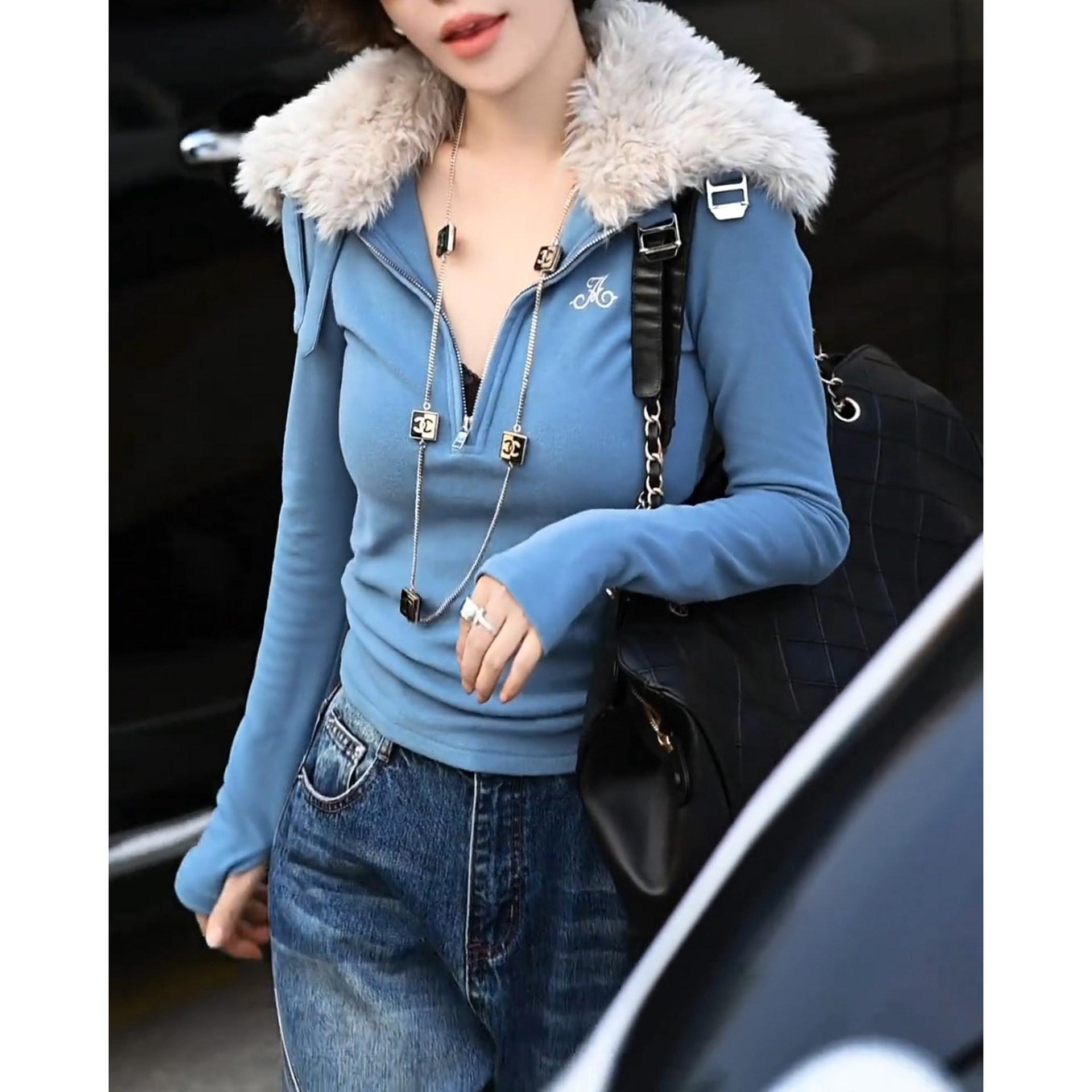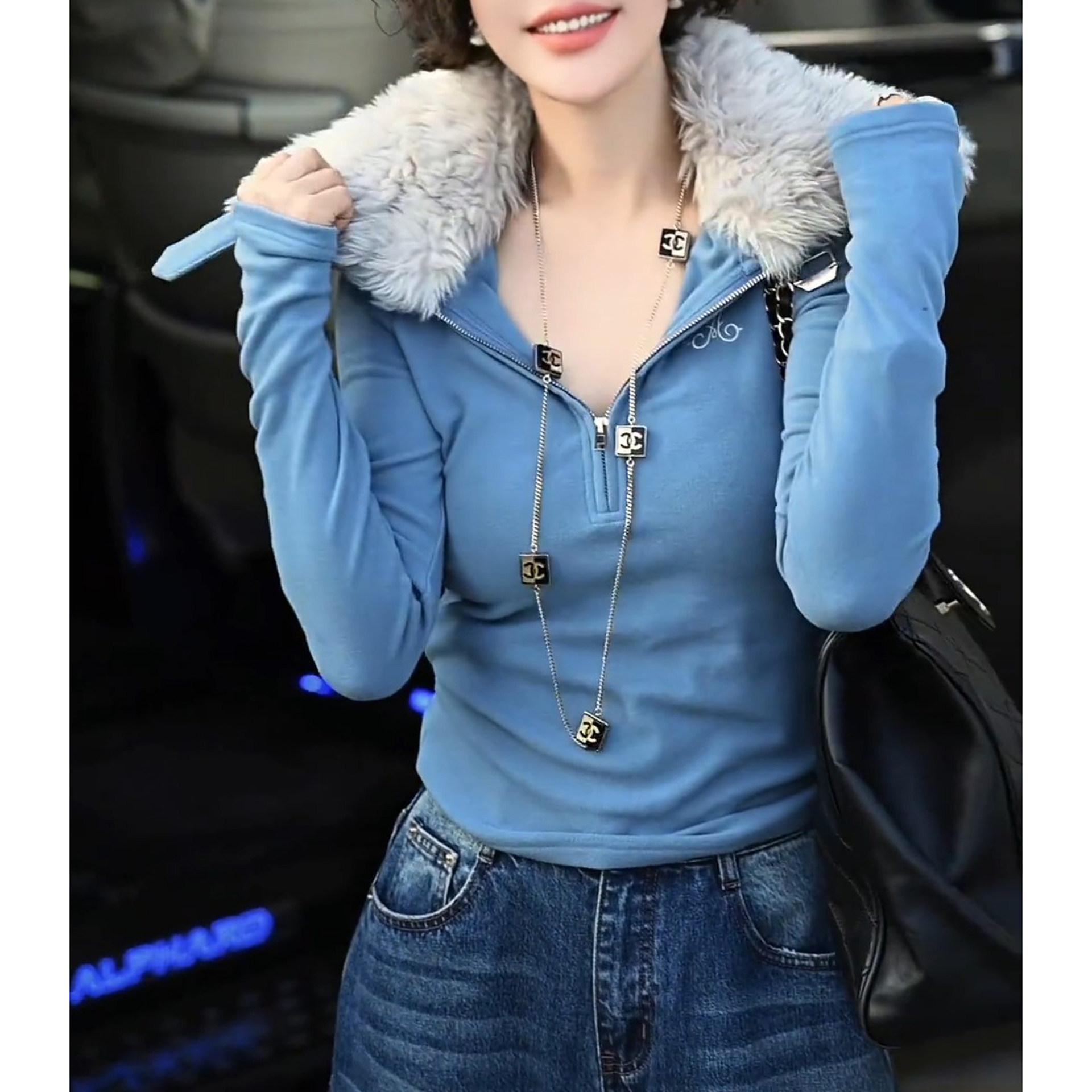 FA56662# 时尚休闲百搭毛领保暖卫衣女春款洋气半拉链长袖上衣 服裝批發女裝批發服飾貨源