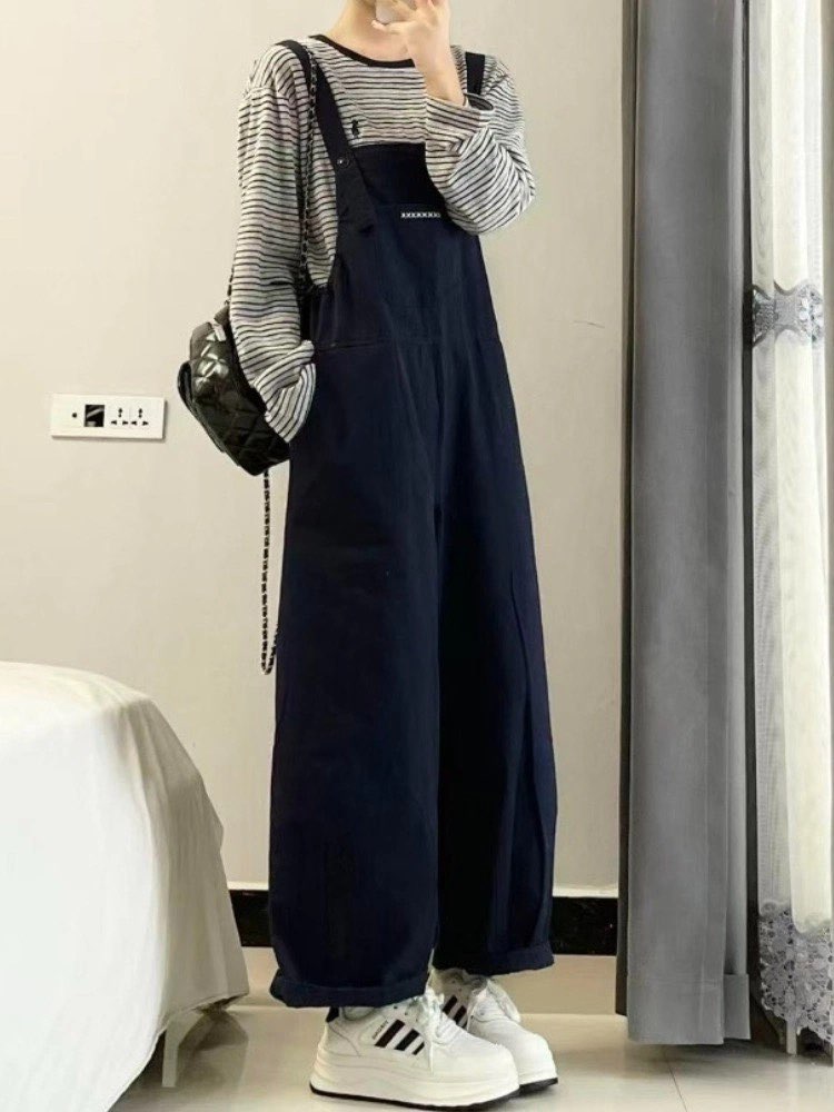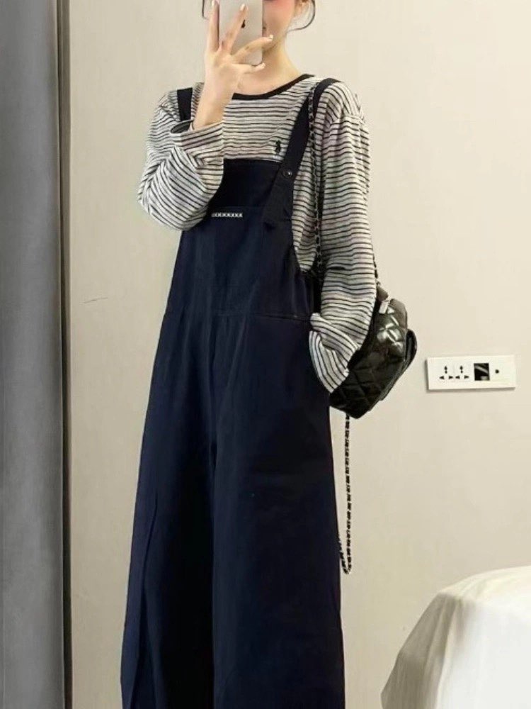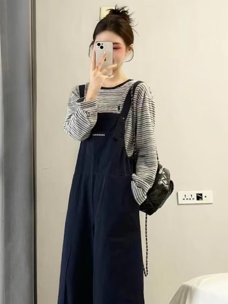 FA56668# 今年流行爆款韩版独特超好看慵懒风显瘦藏青色字母印花工装背带裤 服裝批發女裝批發服飾貨源