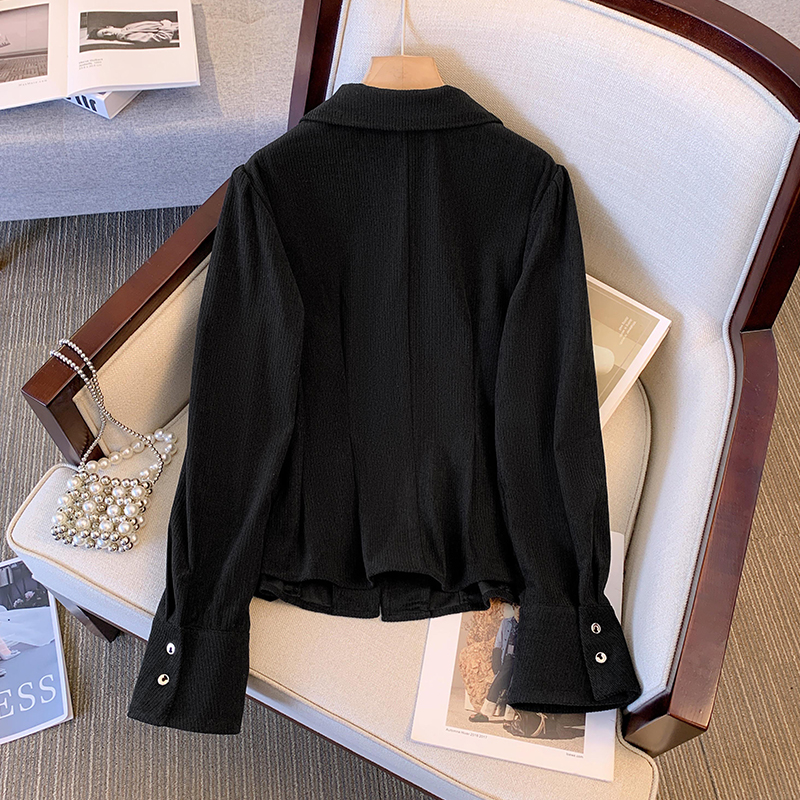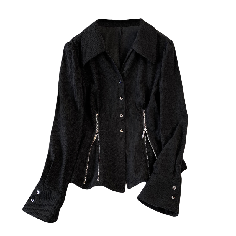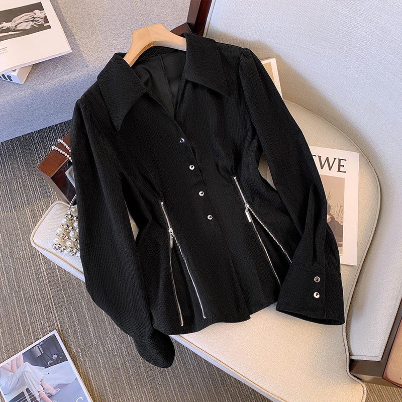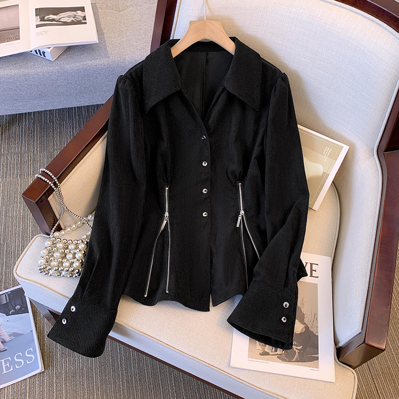 FA56669# 大码女装胖mm秋季设计感polo领衬衫收腰显瘦拉链洋气上衣 服裝批發女裝批發服飾貨源