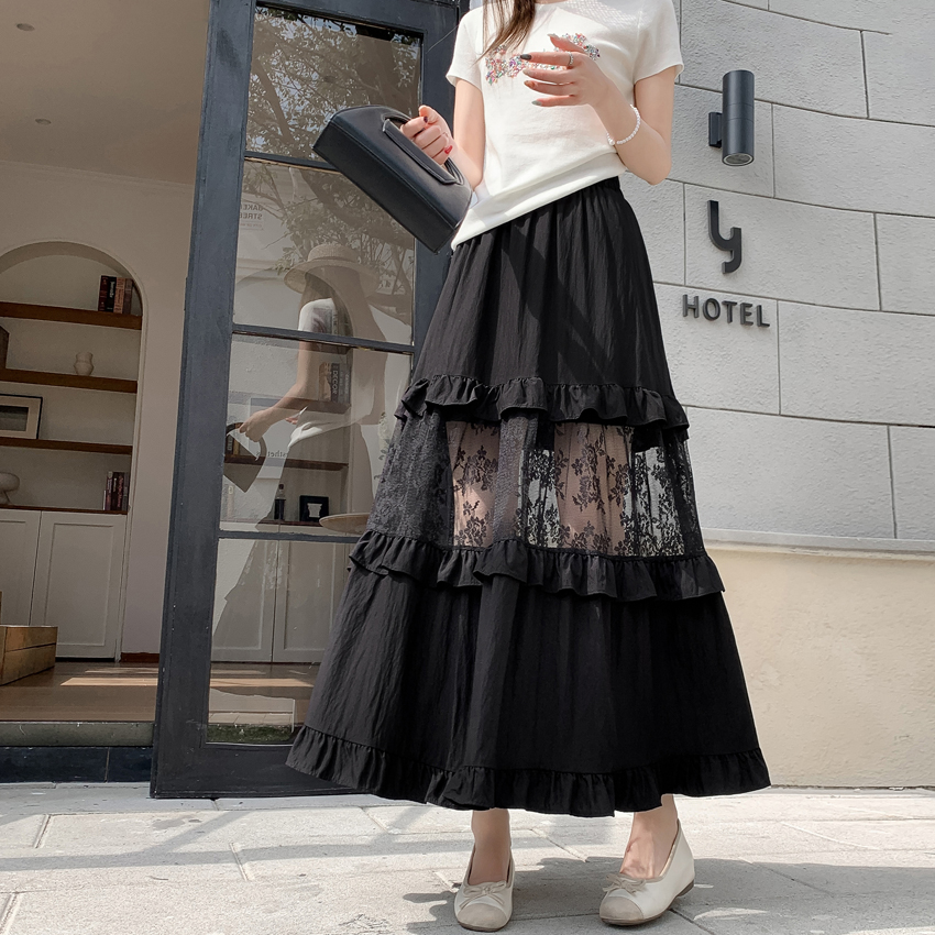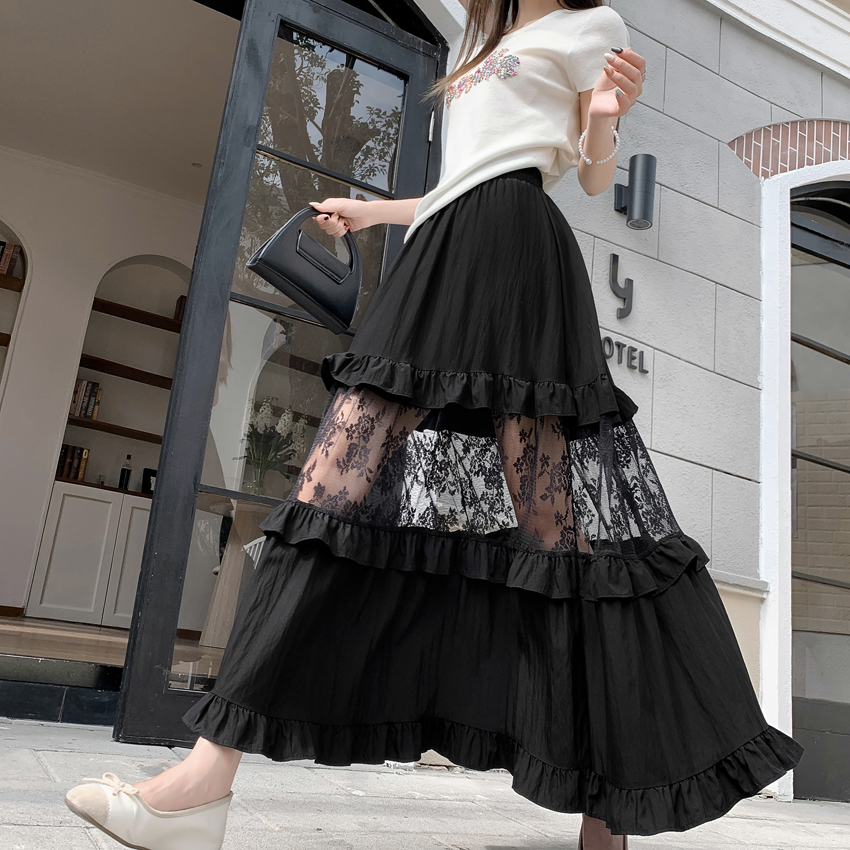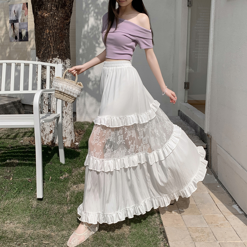 FA56678# 小众设计感白色中长款半身裙女春夏蕾丝拼接木耳边蛋糕裙裙子 服裝批發女裝批發服飾貨源