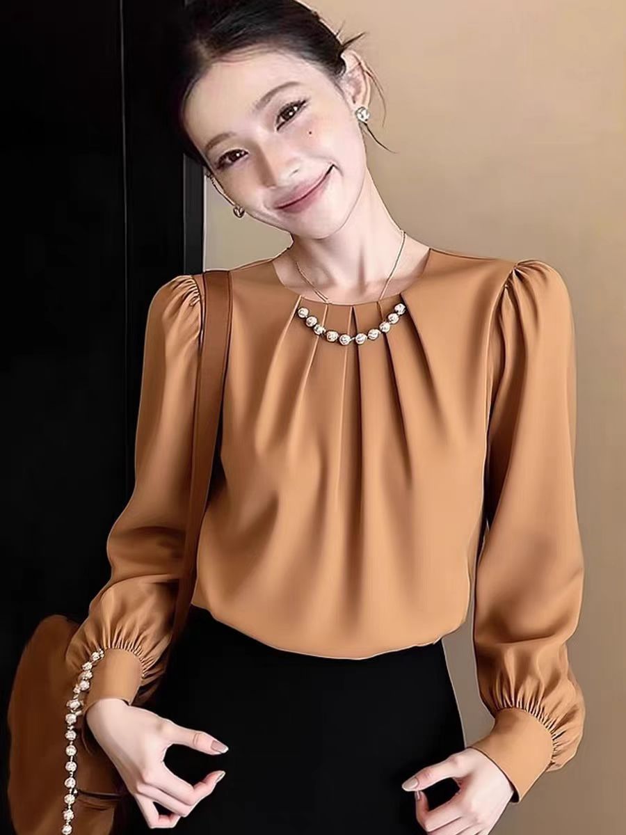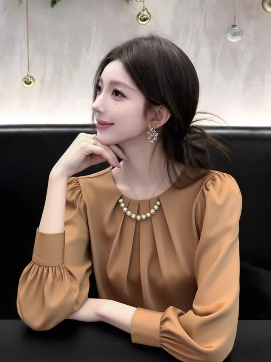 FA56691# 法式温柔风珍珠链条褶皱灯笼袖缎面衬衫女设计感小众遮肚上衣 服裝批發女裝批發服飾貨源