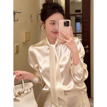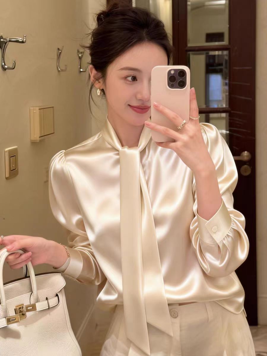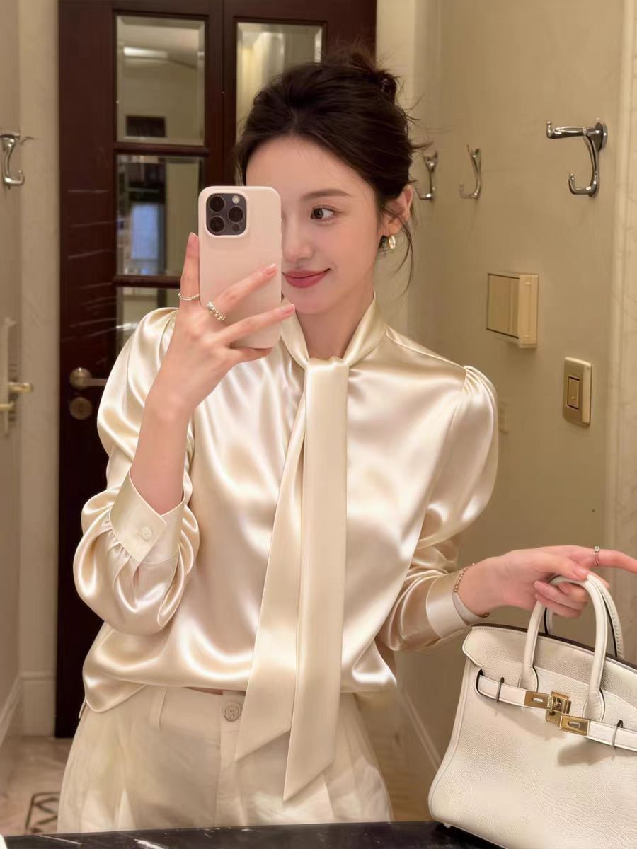 FA56693# 法式气质白色蝴蝶结雪纺衬衫女春季新款立体花朵系带洋气上衣 服裝批發女裝批發服飾貨源