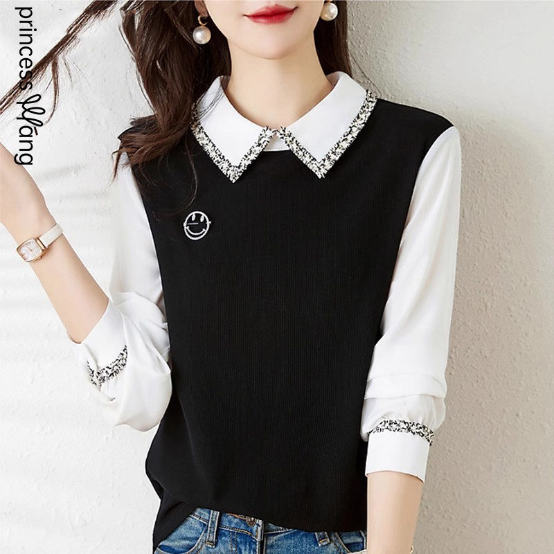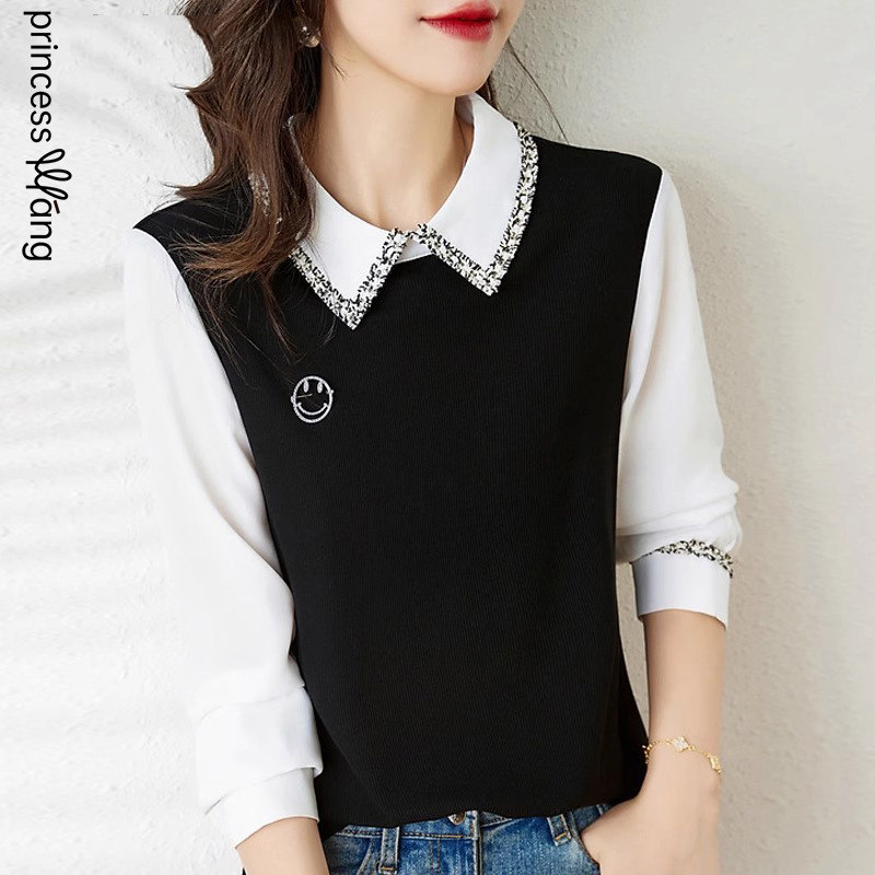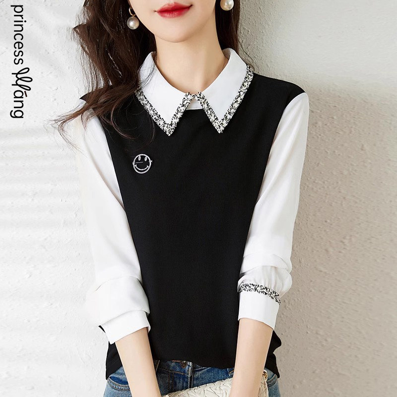 FA56698# 小香风织带翻领衬衫女设计感小众新款春季法式假两件打底上衣 服裝批發女裝批發服飾貨源