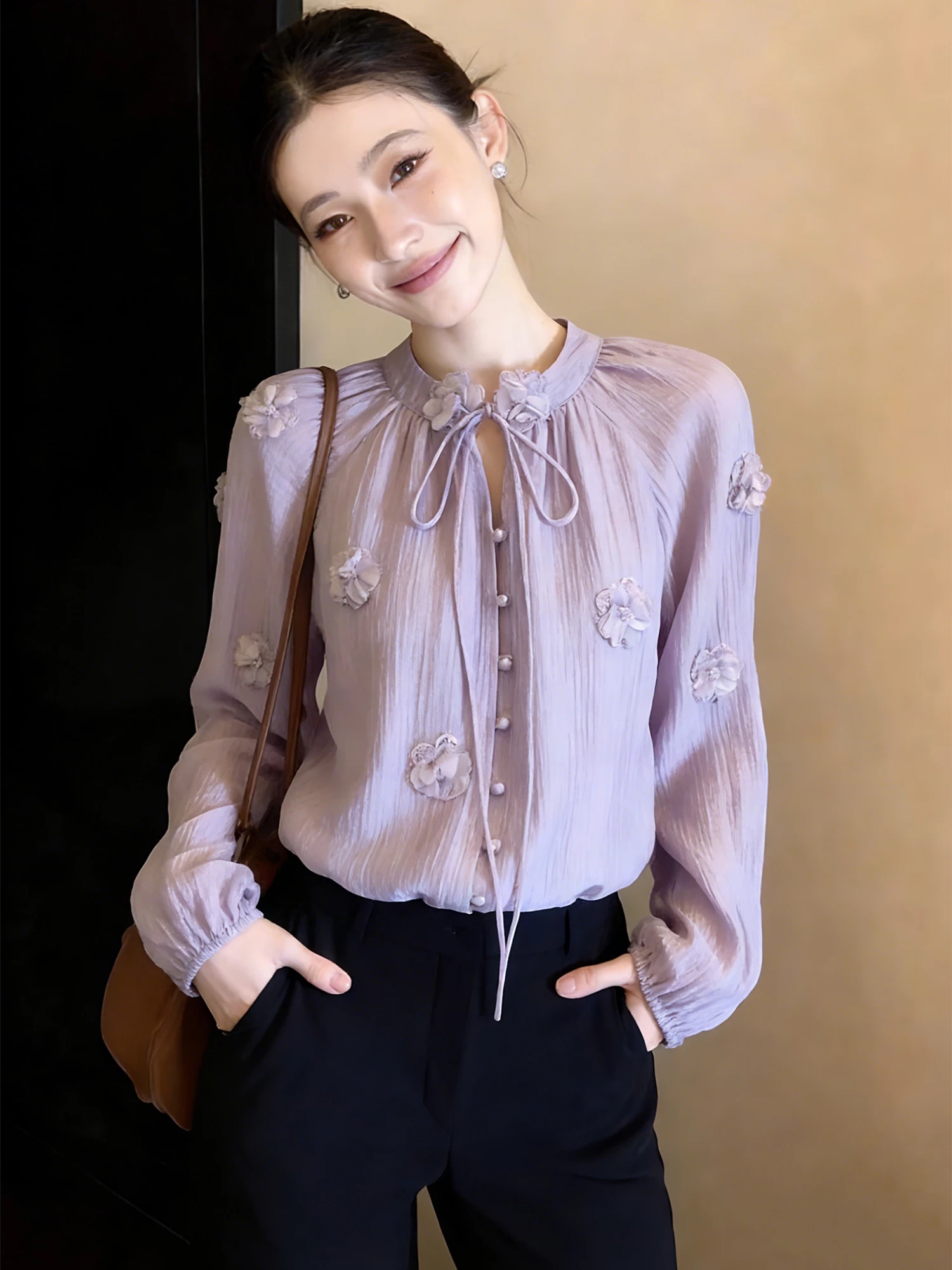 FA56720# 紫色衬衫女长袖春季新款独特漂亮超好看气质系带内搭小衬衣 服裝批發女裝批發服飾貨源