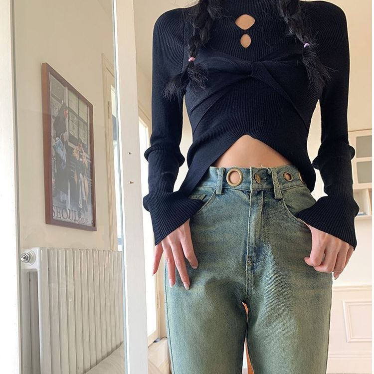 FA56723# 设计感新中式套头半高领镂空针织衫上衣女春季新款黑色毛衣潮 服裝批發女裝批發服飾貨源