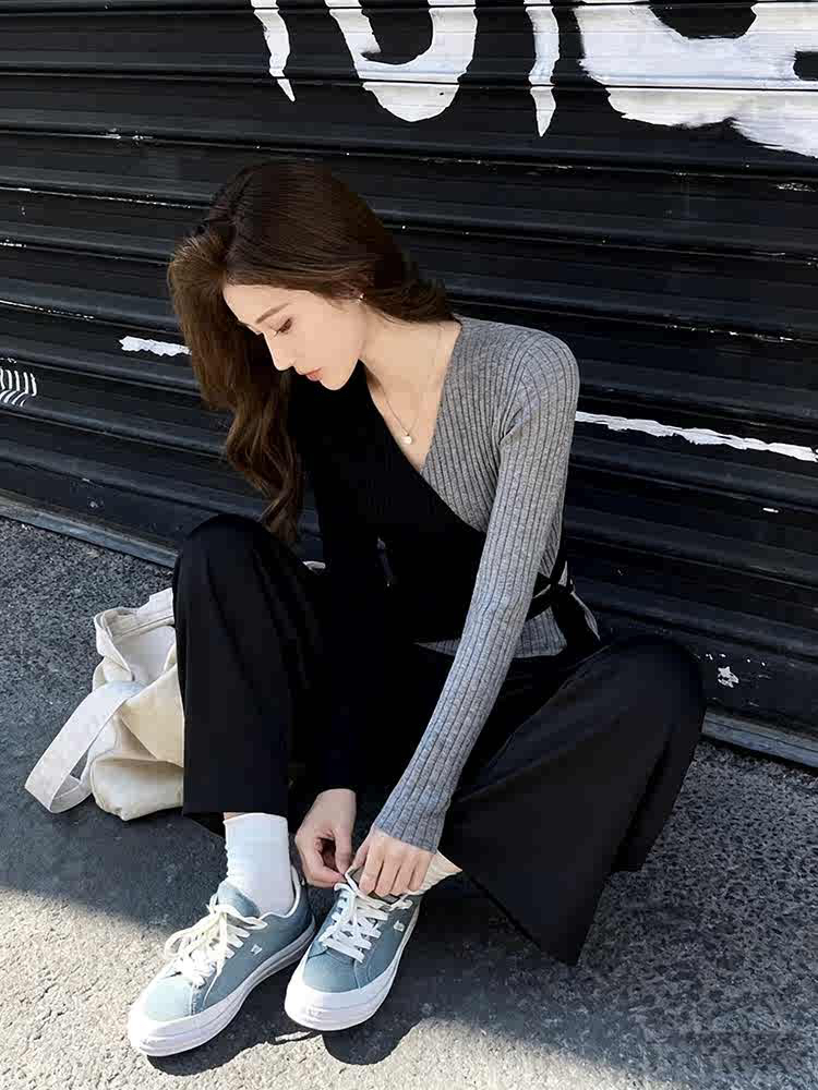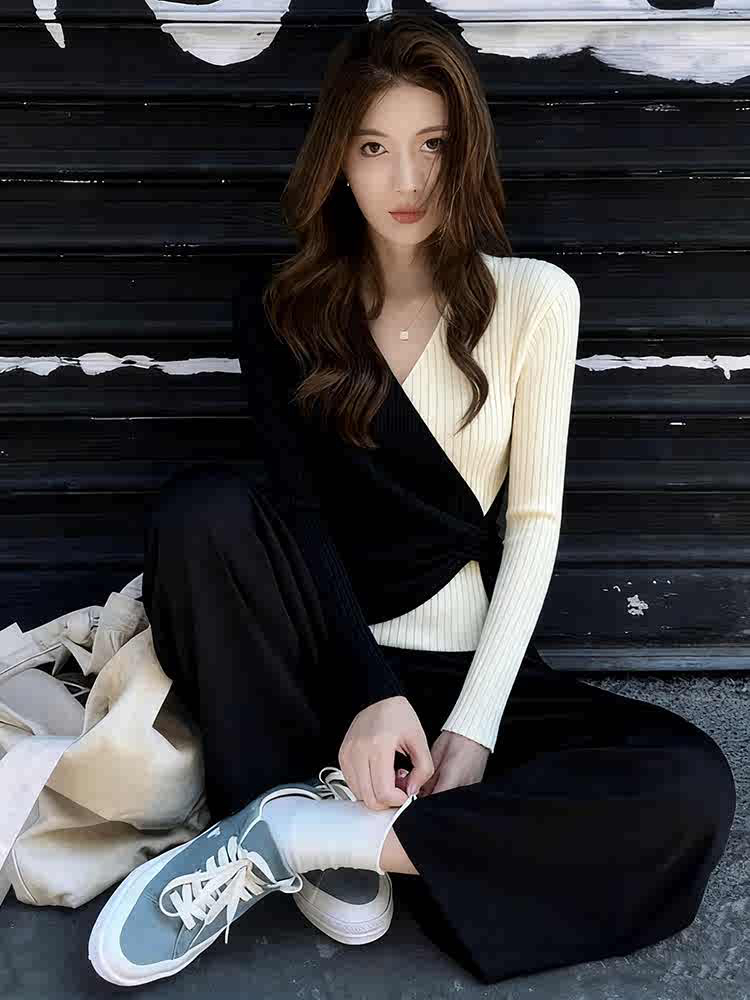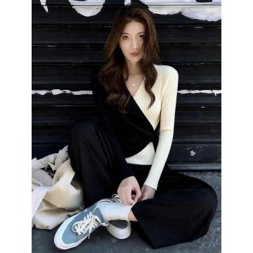 FA56724# 设计感不规则交叉撞色v领针织衫上衣女春季新款显瘦百搭毛衣 服裝批發女裝批發服飾貨源
