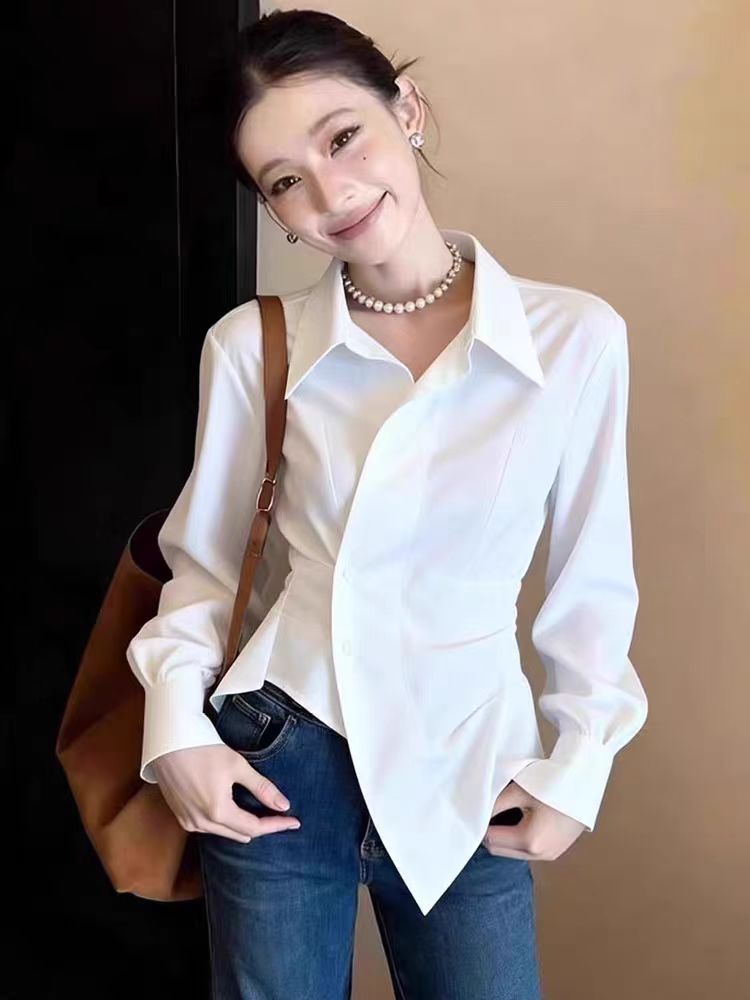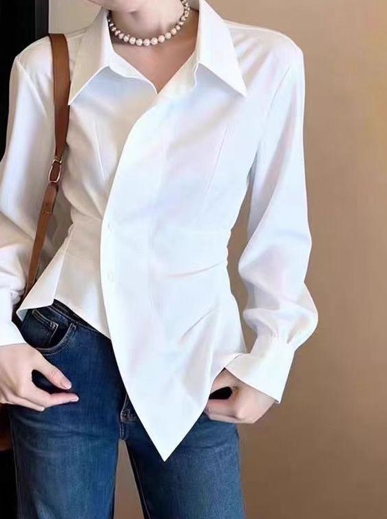 FA56736# 早春法式复古不规则白色纯欲长袖绝美上衣女士设计感小众独特上衣 服裝批發女裝批發服飾貨源