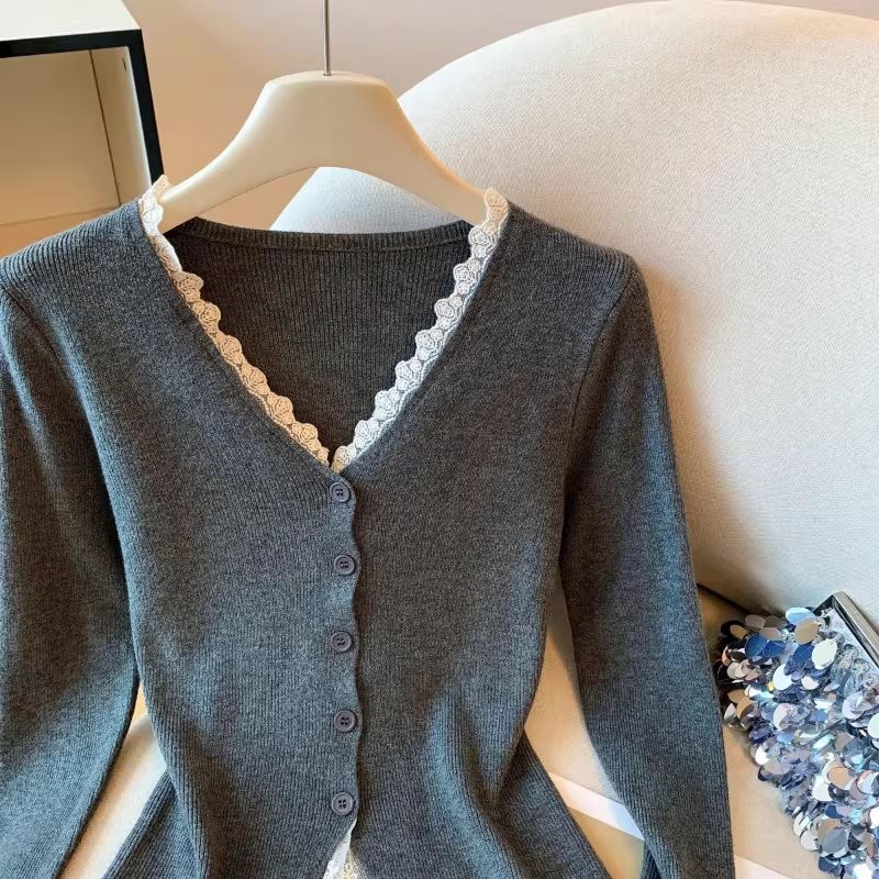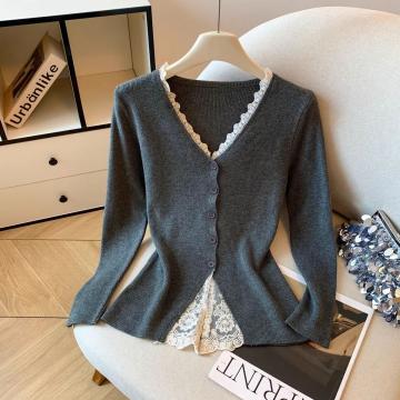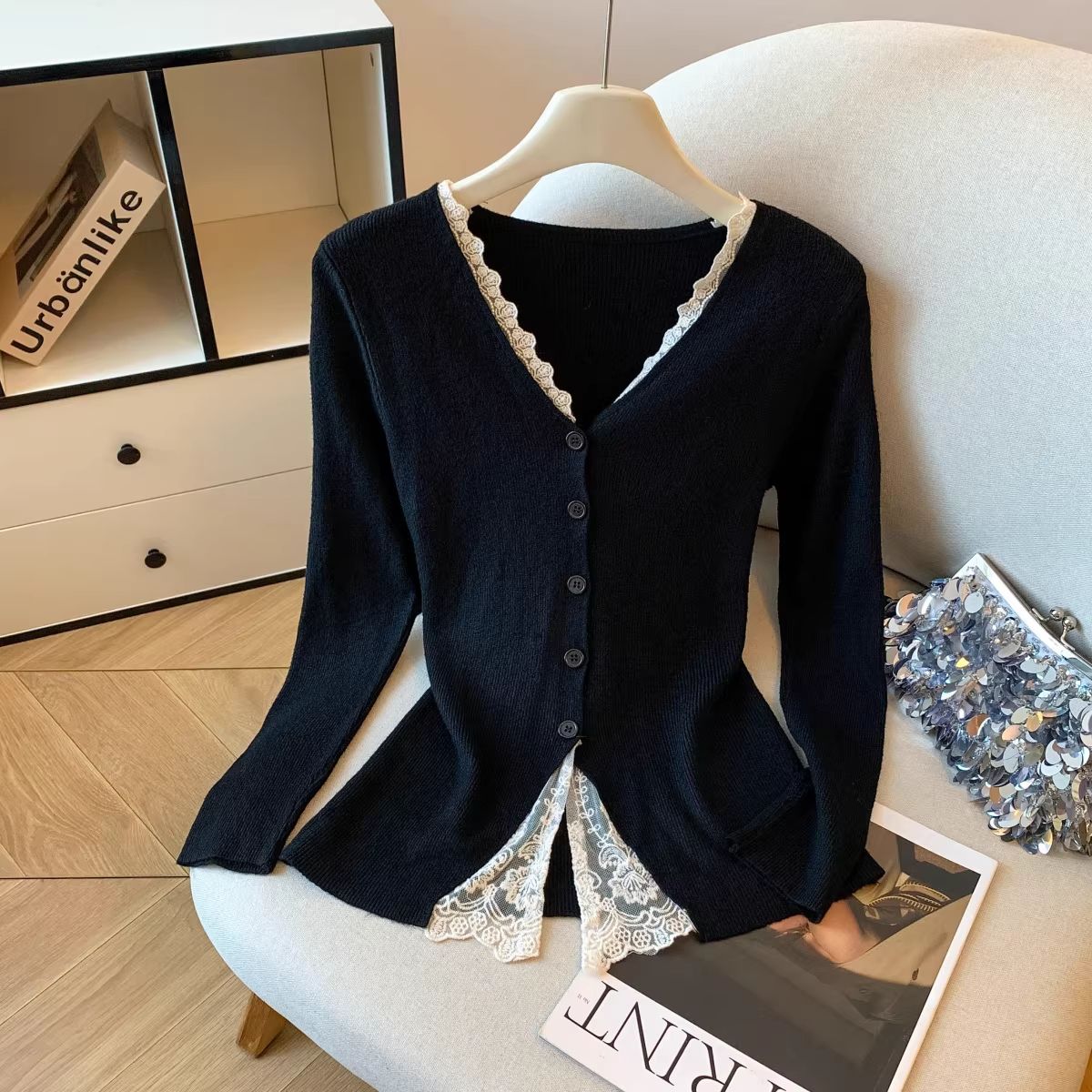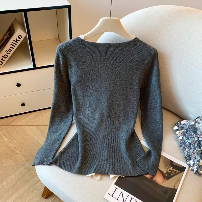 FA56739# 春秋季法式高级感蕾丝拼接修身长袖T恤女气质开叉打底衫上衣 服裝批發女裝批發服飾貨源
