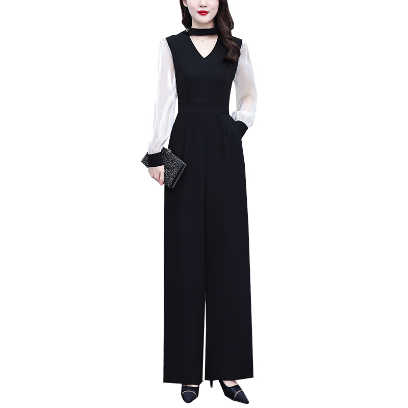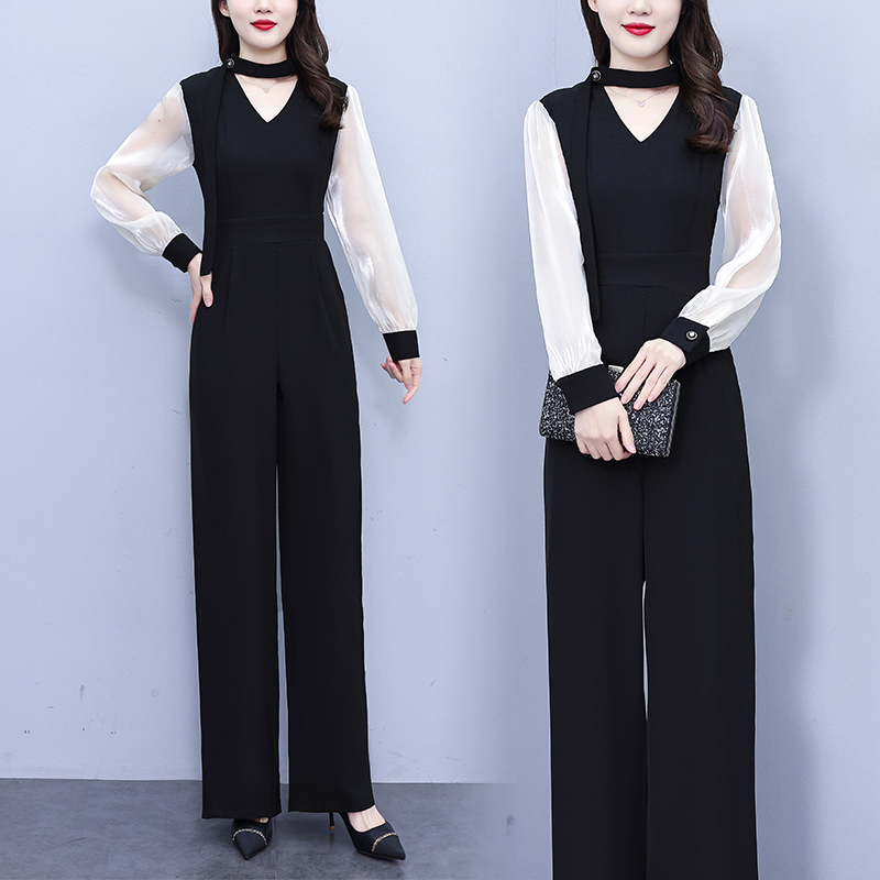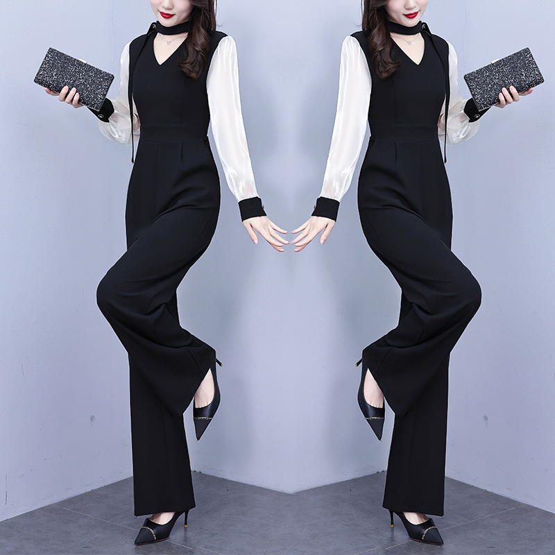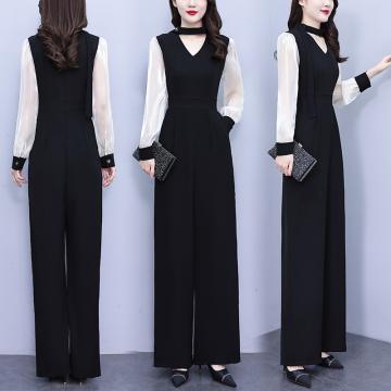 FA56753# 春秋季新款气质设计感高腰阔腿裤长袖拼接黑色连体裤女 服裝批發女裝批發服飾貨源