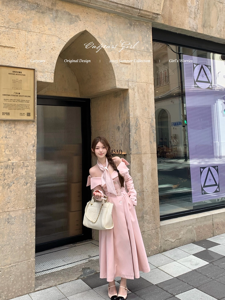 FA56754# 韩版高级感时尚气质一字肩收腰长款风衣小众独特超好看外套 服裝批發女裝批發服飾貨源