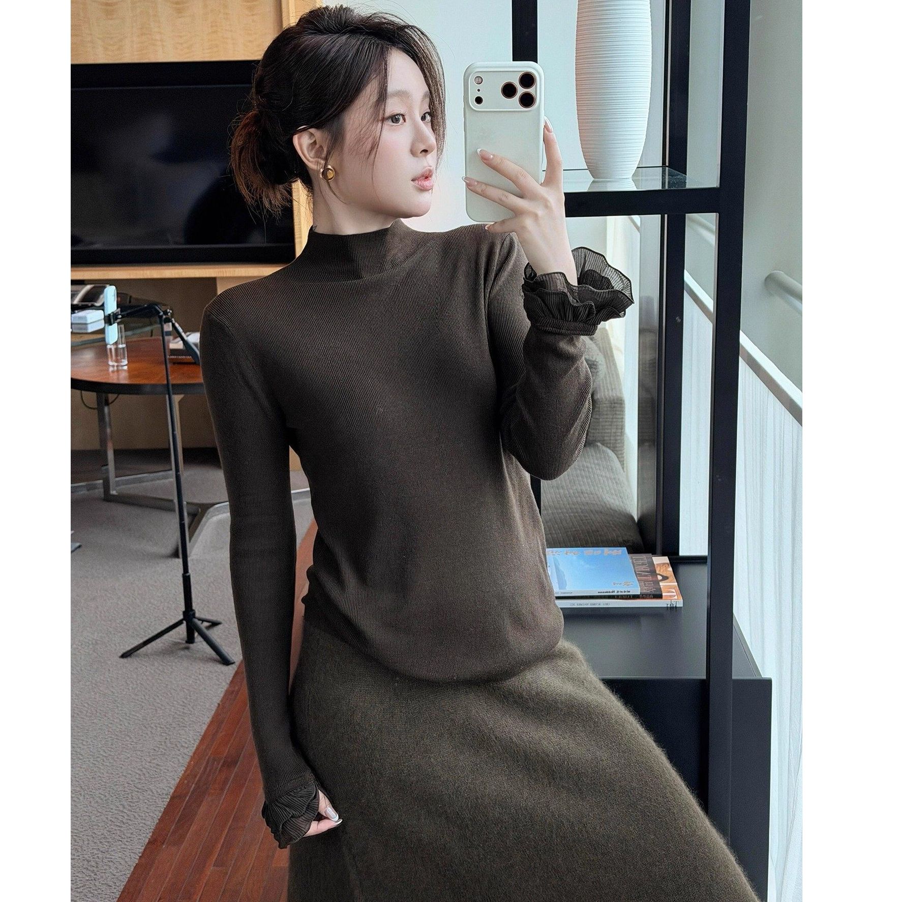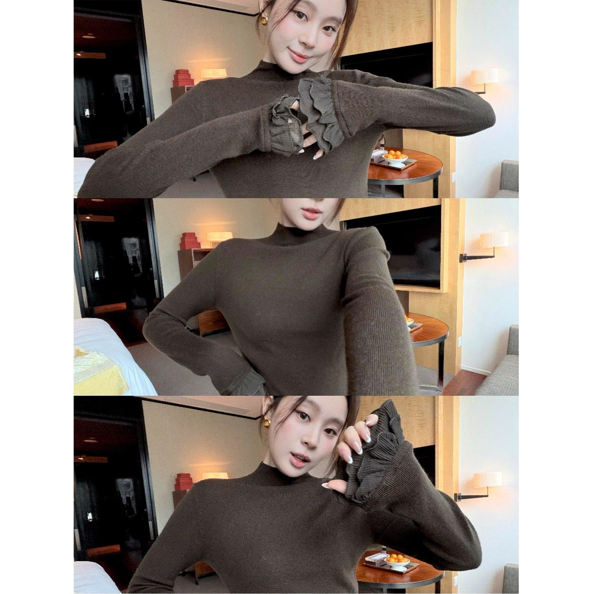 FA56766# 不减六半羊毛双层花瓣喇叭袖T恤修身显瘦打底衫漂亮上衣 服裝批發女裝批發服飾貨源
