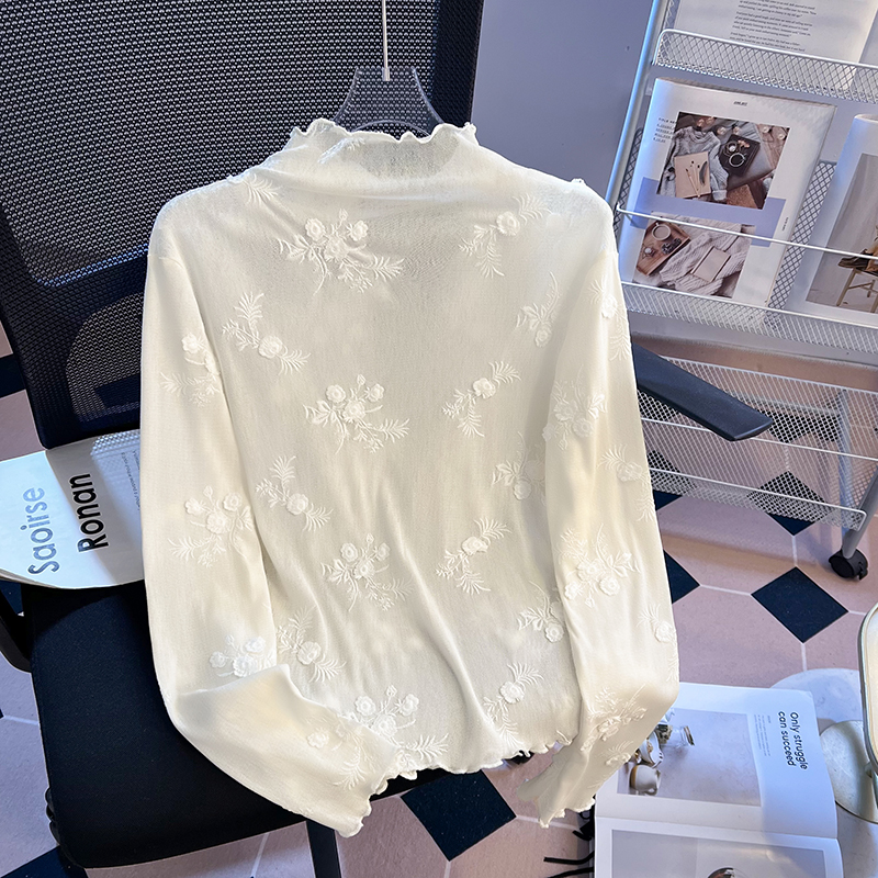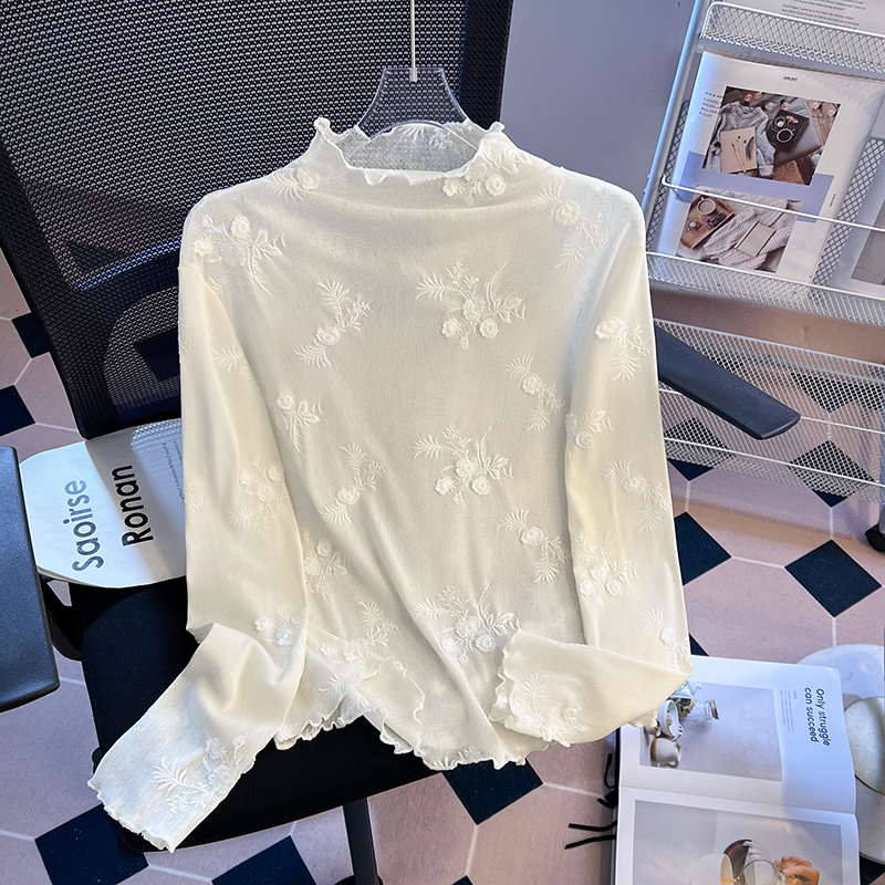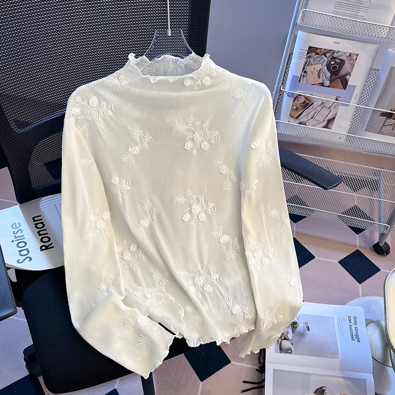 FA56775# 半高领蕾丝打底衫女秋冬新款木耳边高级感内搭网纱上衣女 服裝批發女裝批發服飾貨源