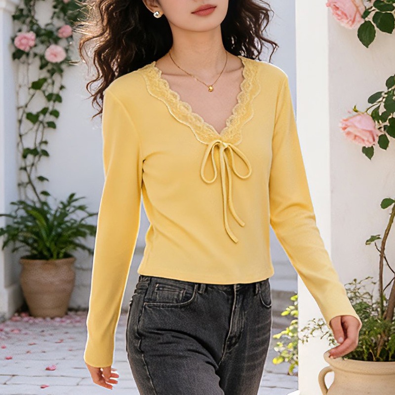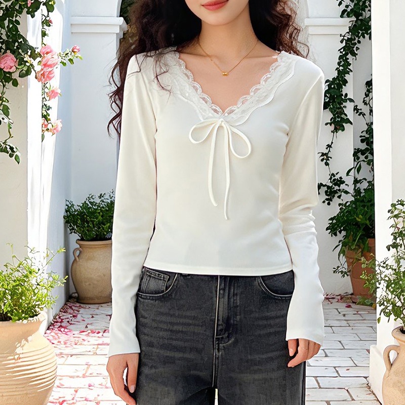 FA56779# 蕾丝v领正肩长袖t恤女春季气质蝴蝶结系带上衣打底衫内搭 服裝批發女裝批發服飾貨源
