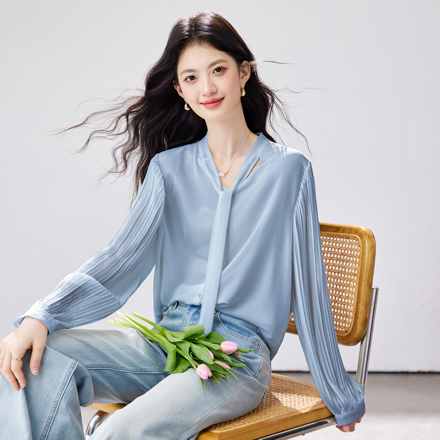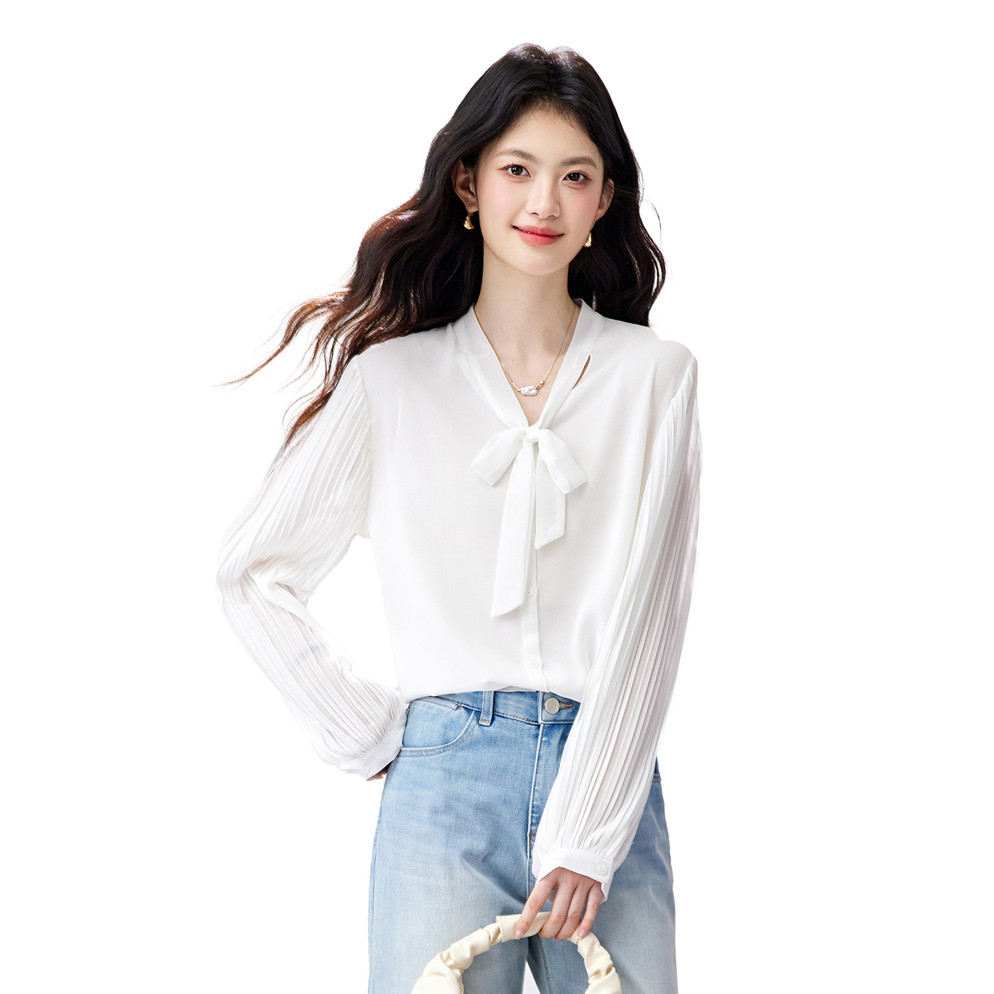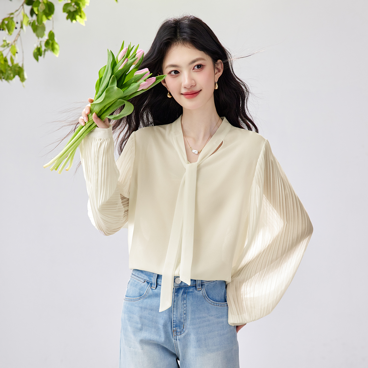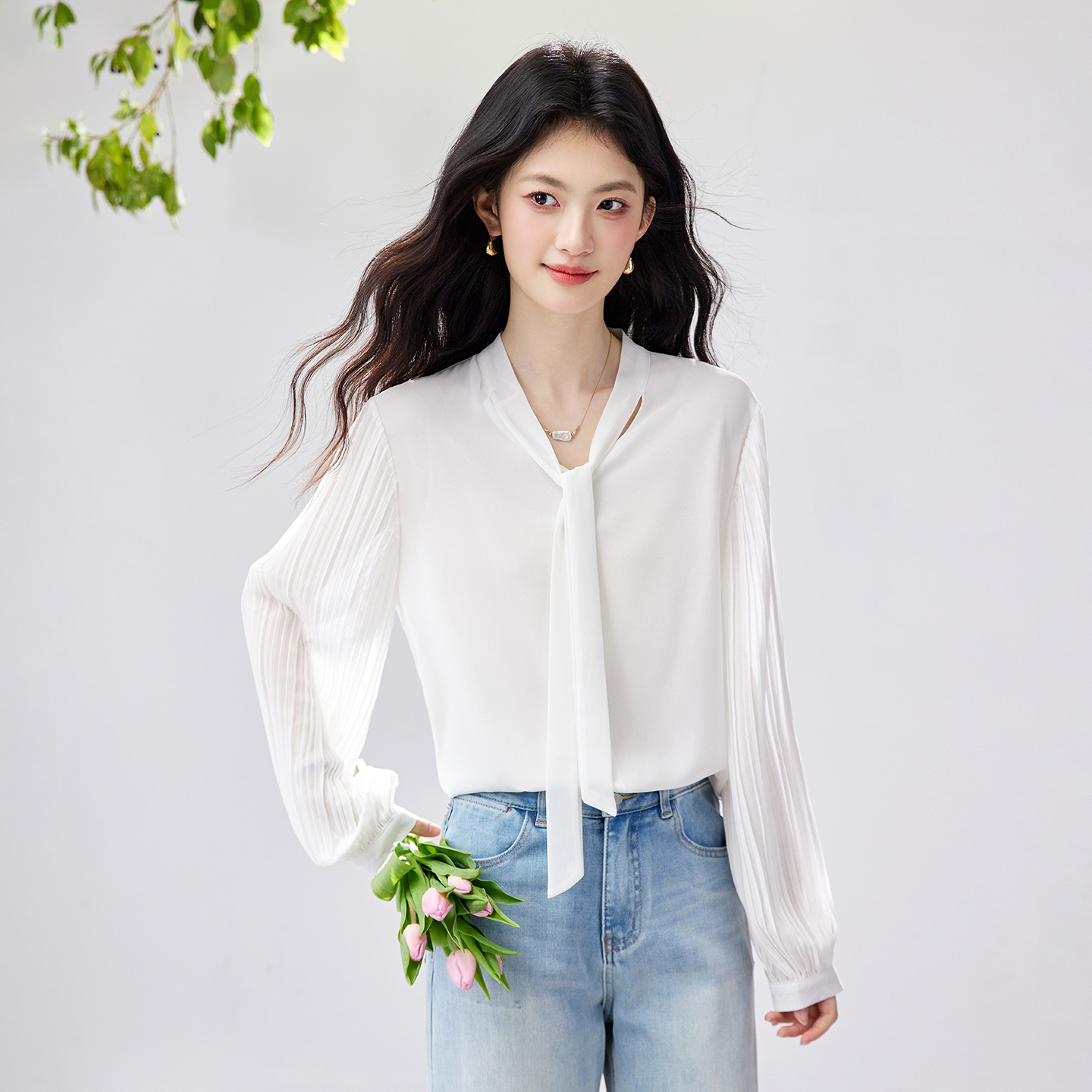 FA56830# 春季新款风琴百褶袖雪纺衬衫垂感不易皱通勤飘带上衣 服裝批發女裝批發服飾貨源