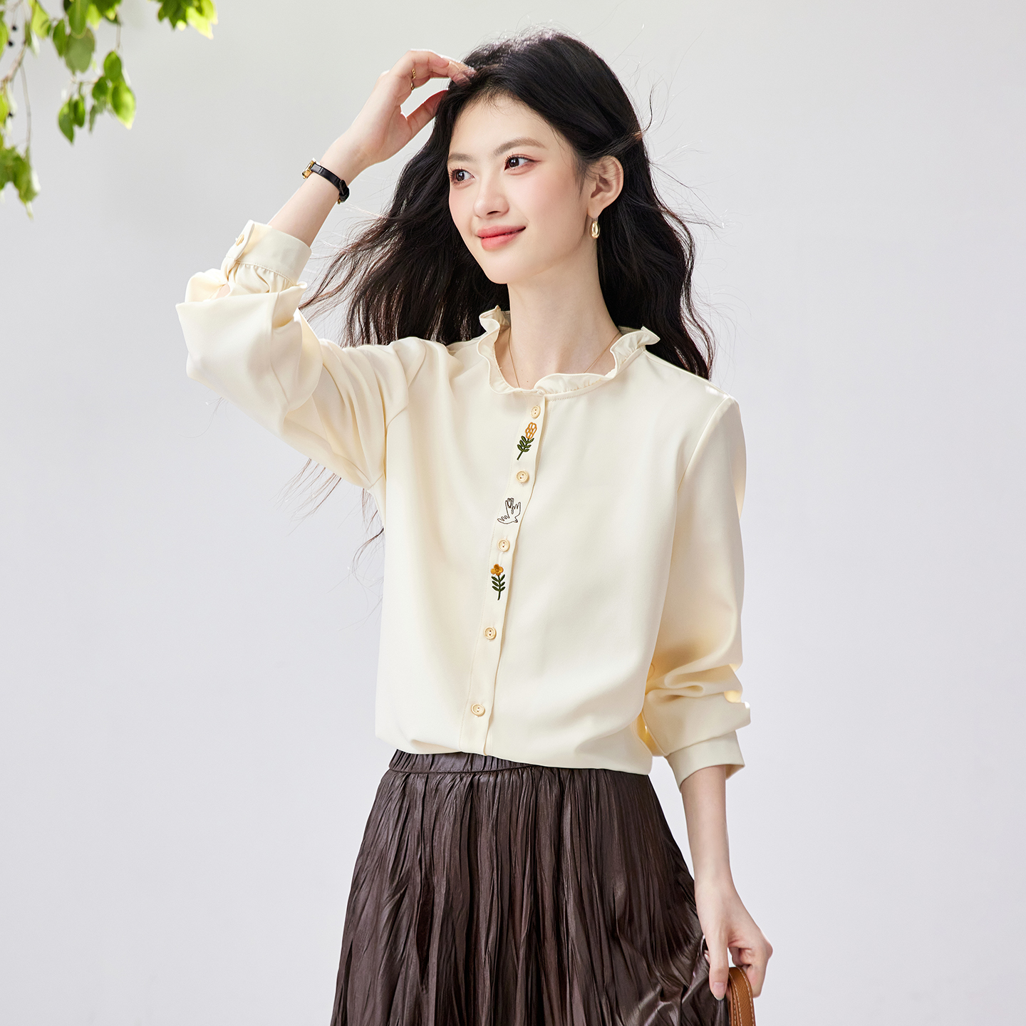 FA56831# 法式木耳边立领长袖衬衫春季新款正肩刺绣衬衣内搭上衣 服裝批發女裝批發服飾貨源