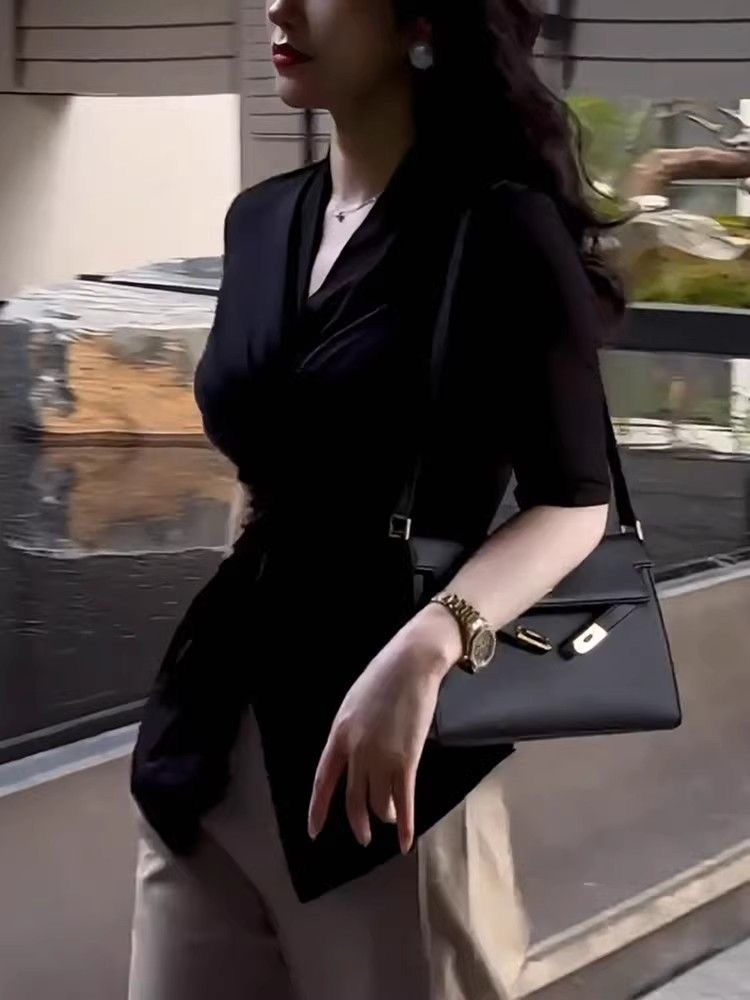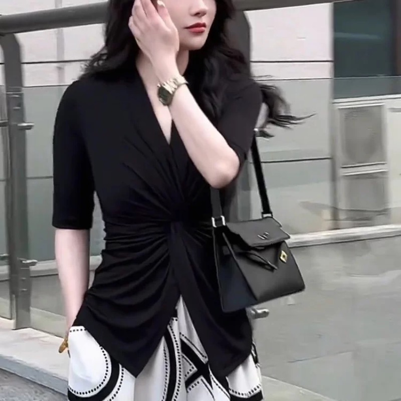 BY10715# 法式高级感扭结V领上衣夏季新款大码时髦洋气显瘦百搭上衣 服裝批發女裝批發服飾貨源