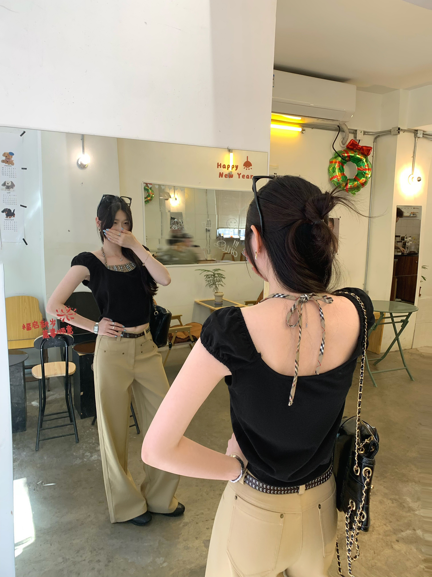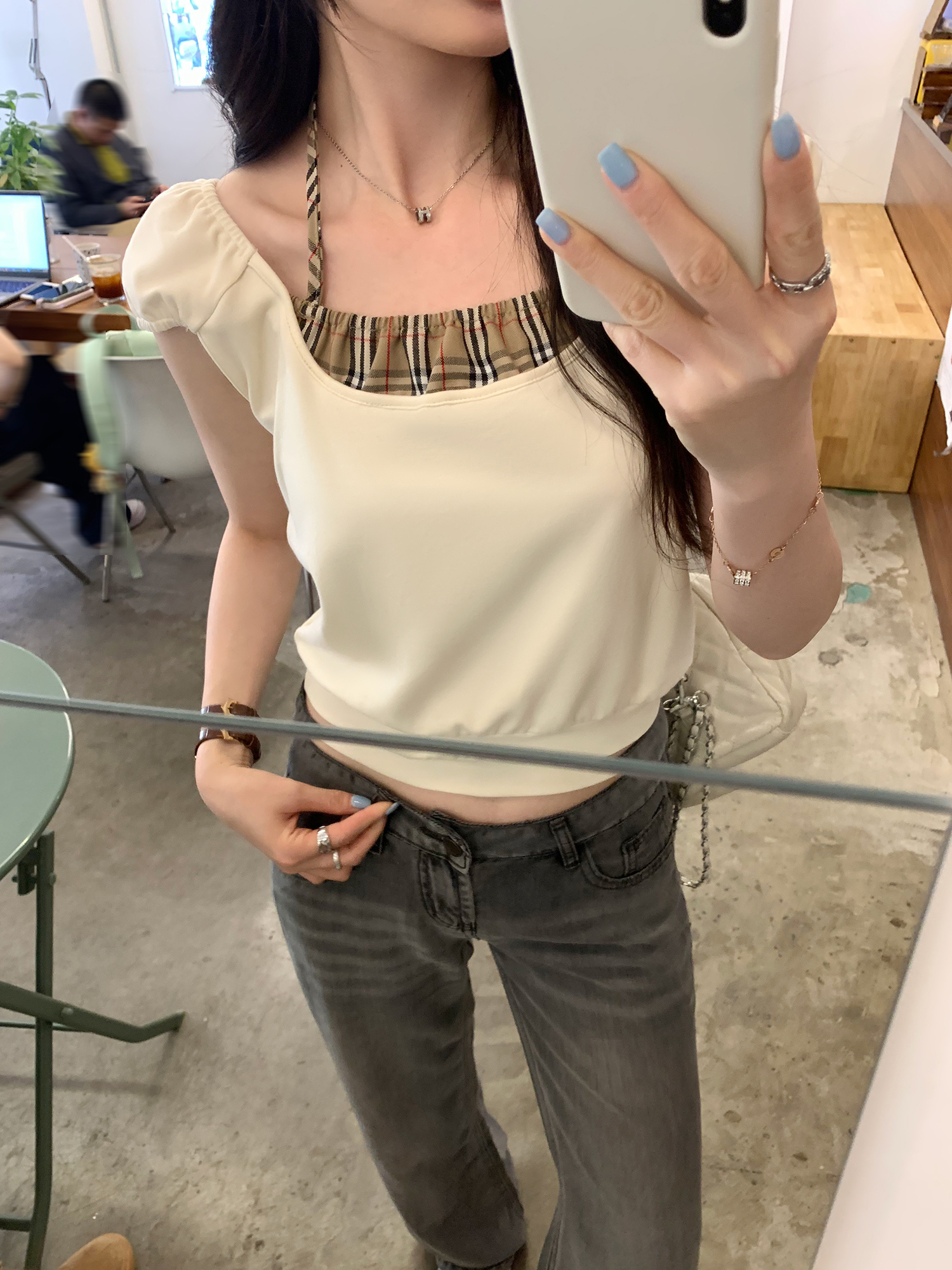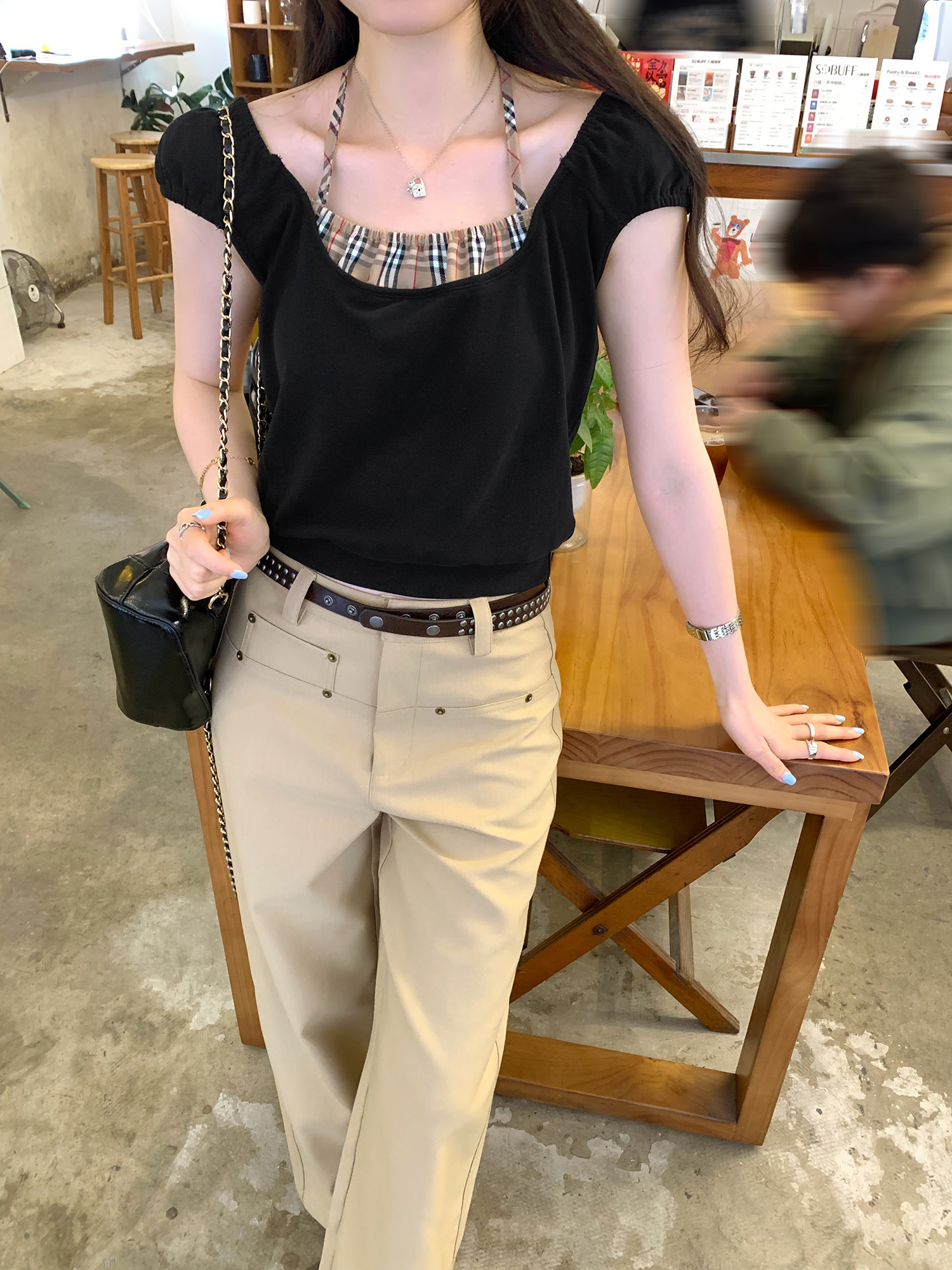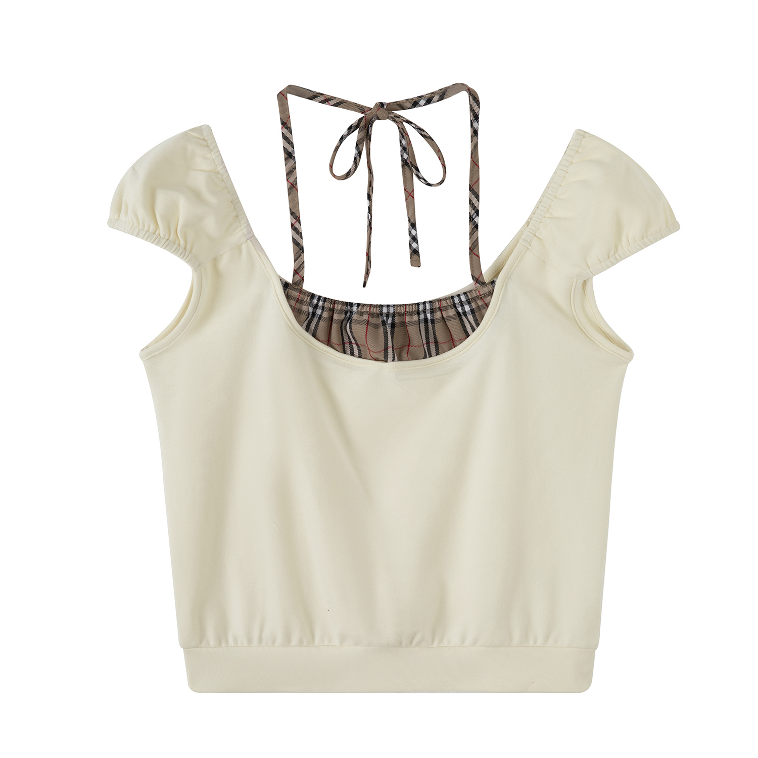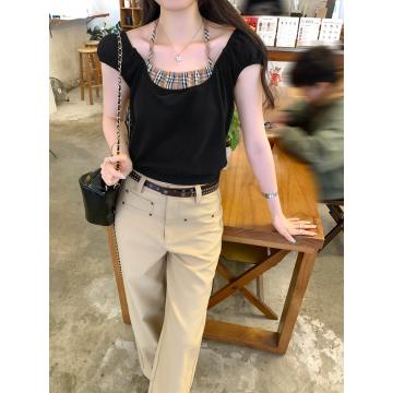 BY12327# 图今年高级漂亮格纹拼接假两件挂脖短袖T恤女夏单穿上衣 服裝批發女裝批發服飾貨源
