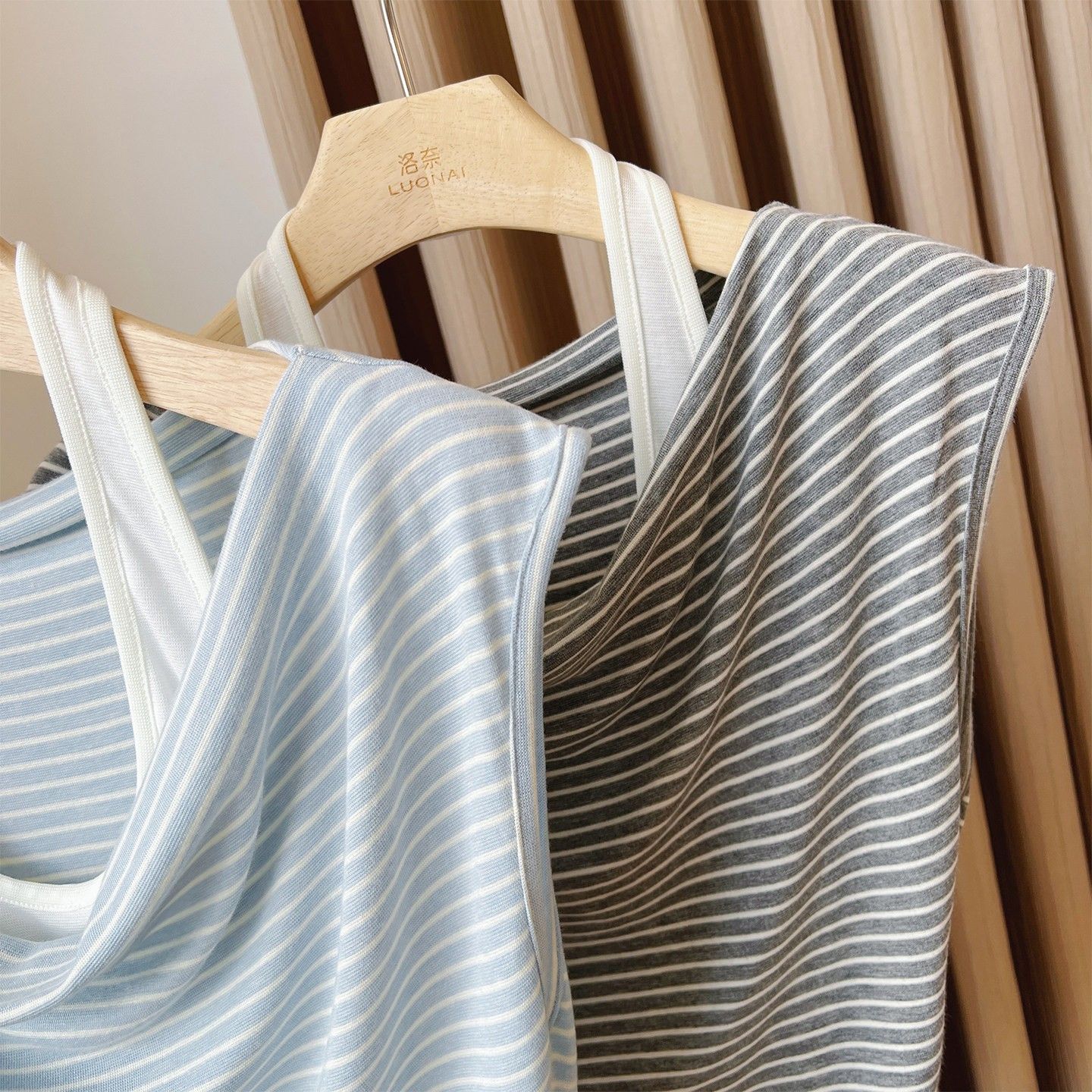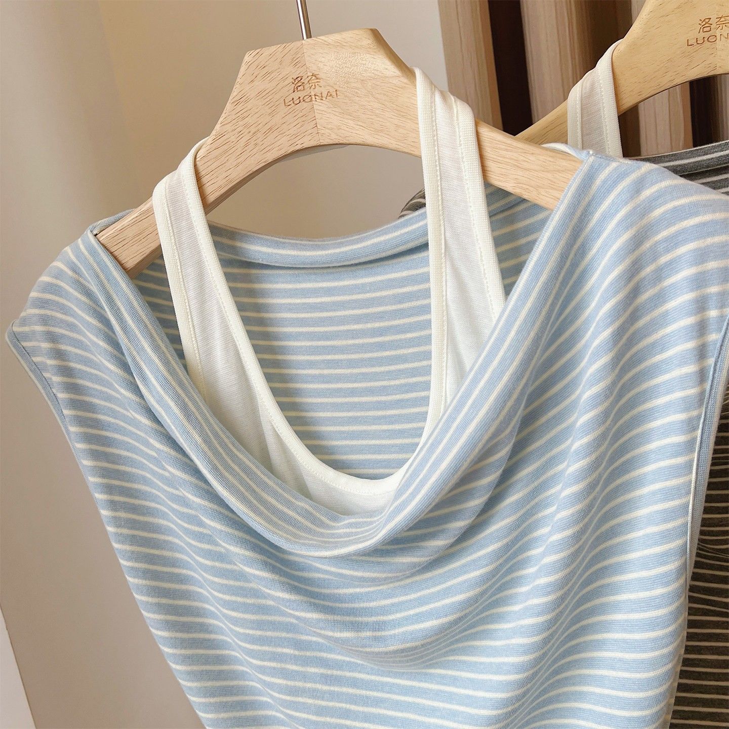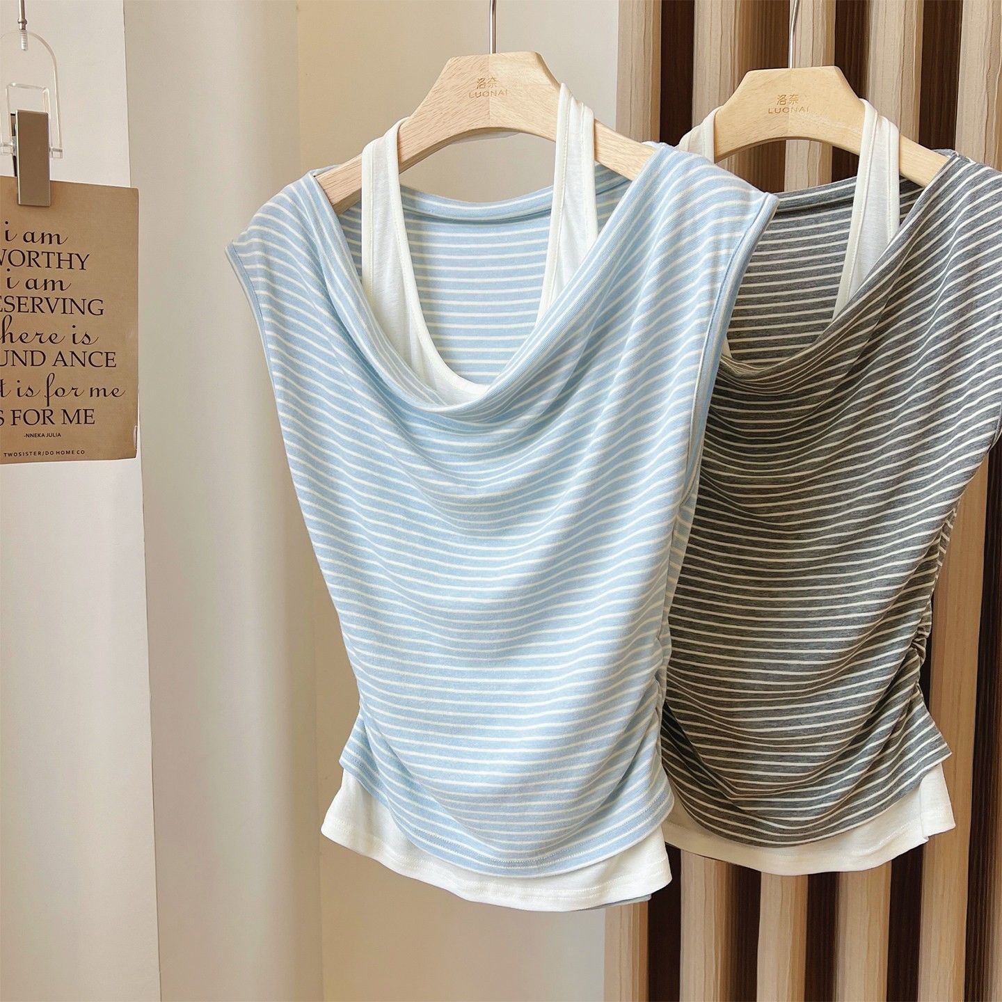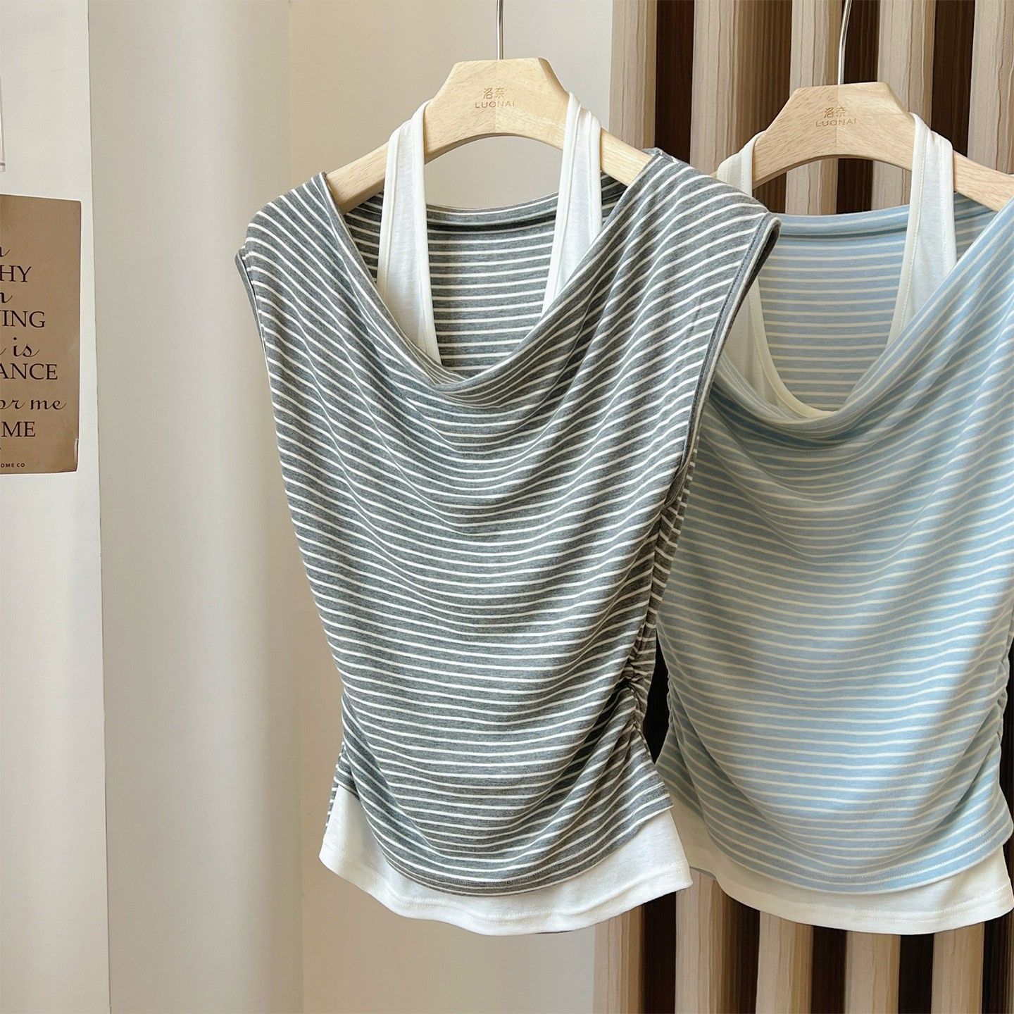 BY12465# 条纹t恤女夏季新款设计感褶皱收腰假两件挂脖坎肩无袖荡领上衣潮 服裝批發女裝批發服飾貨源