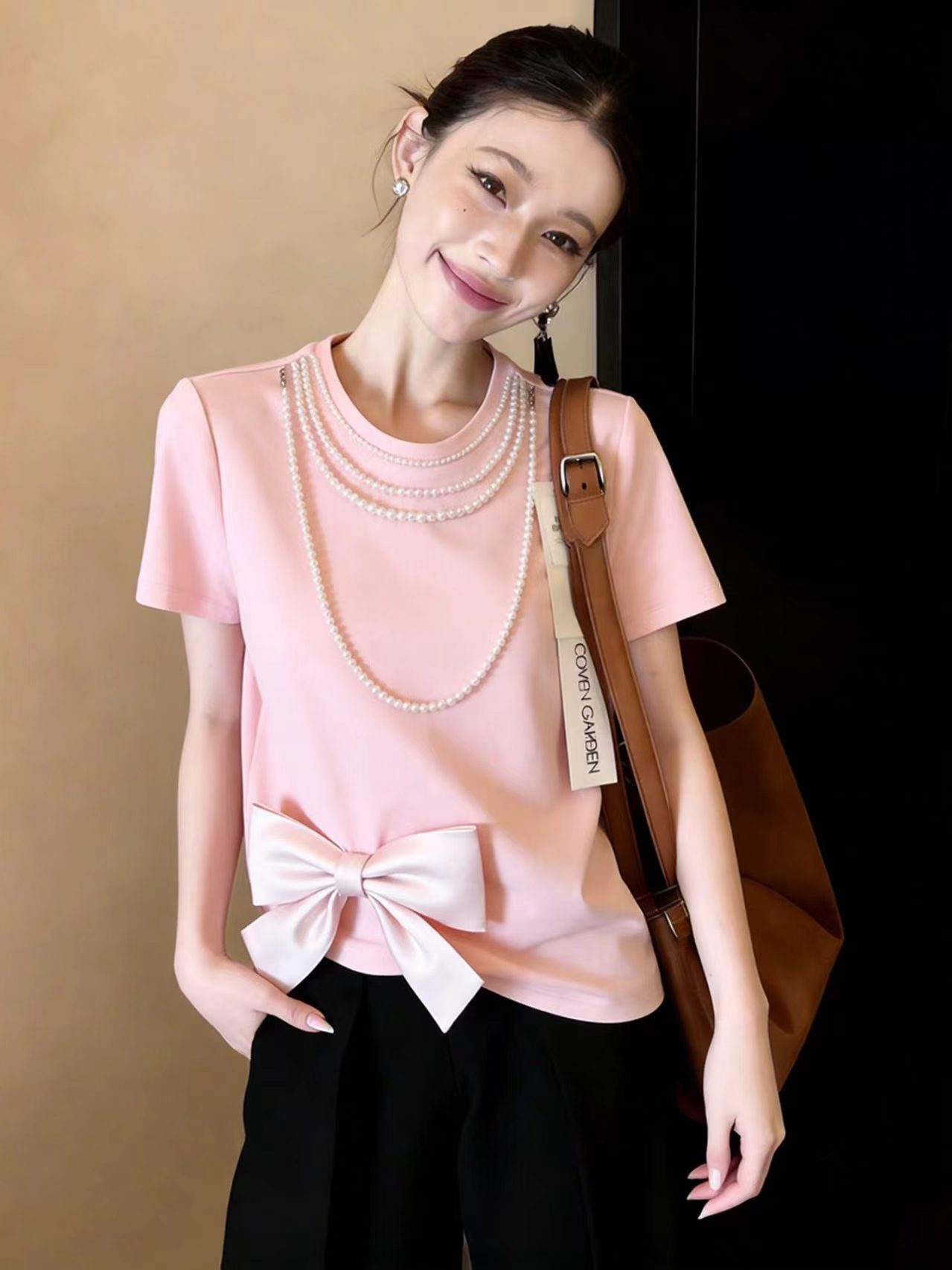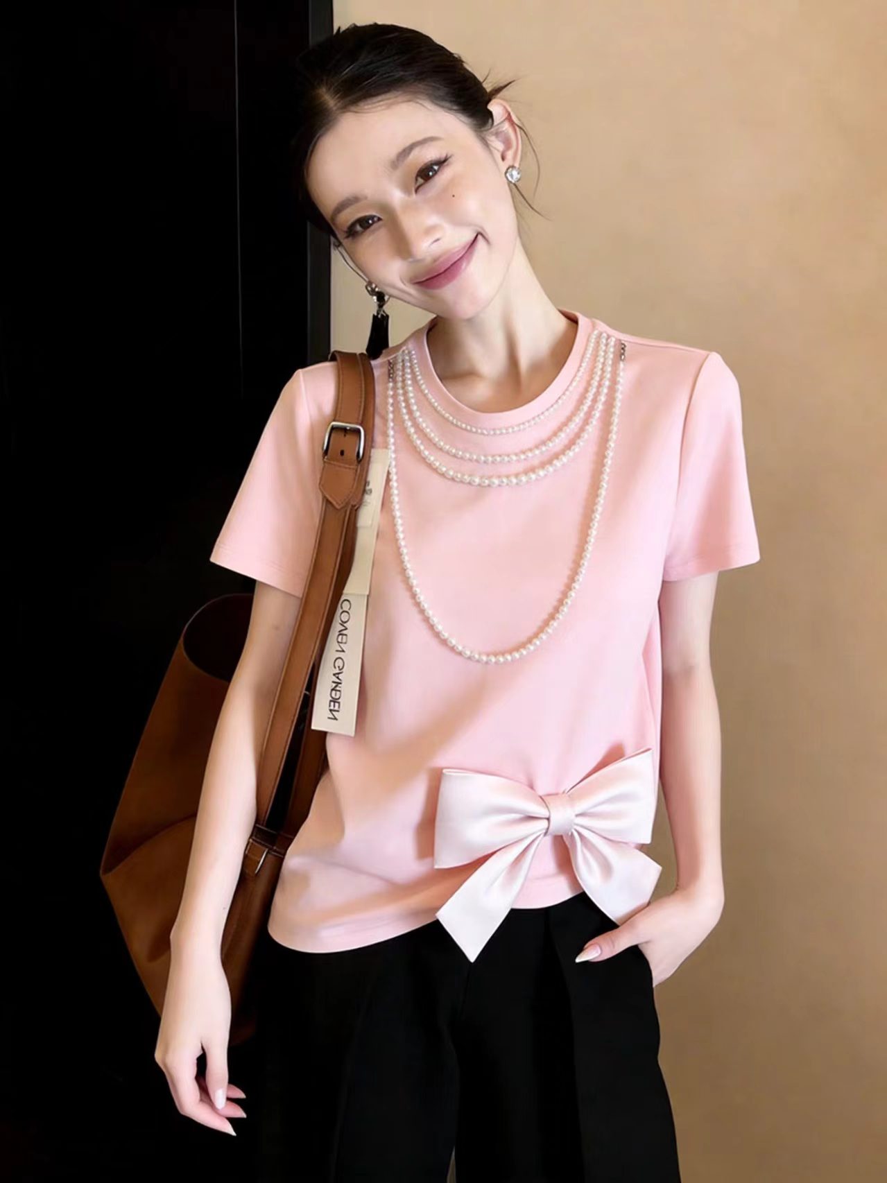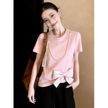 BY12901# 夏季新款高级感千金风珍珠链条蝴蝶结粉色优雅T恤 服裝批發女裝批發服飾貨源