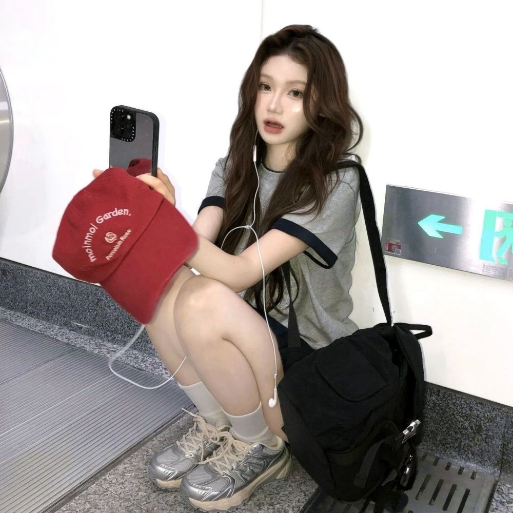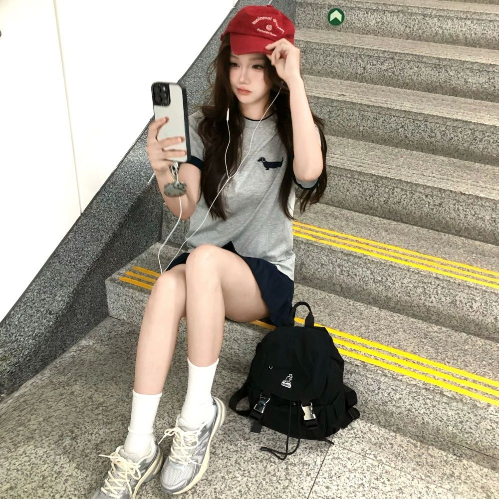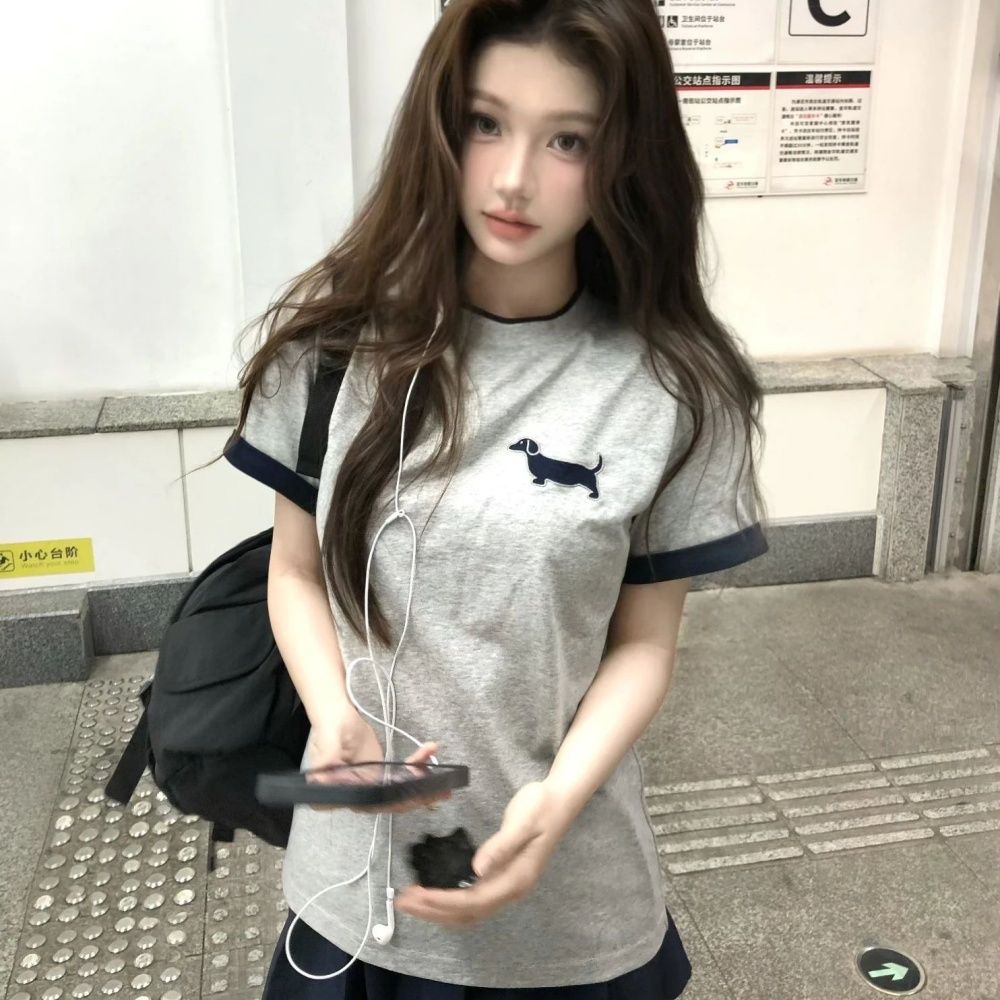 BY12995# 美式复古腊肠狗刺绣撞色短袖T恤女夏季新款宽松百搭纯棉半袖上衣 服裝批發女裝批發服飾貨源