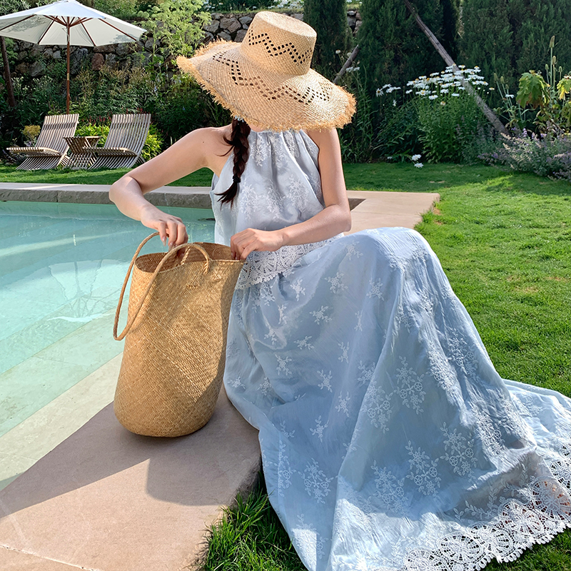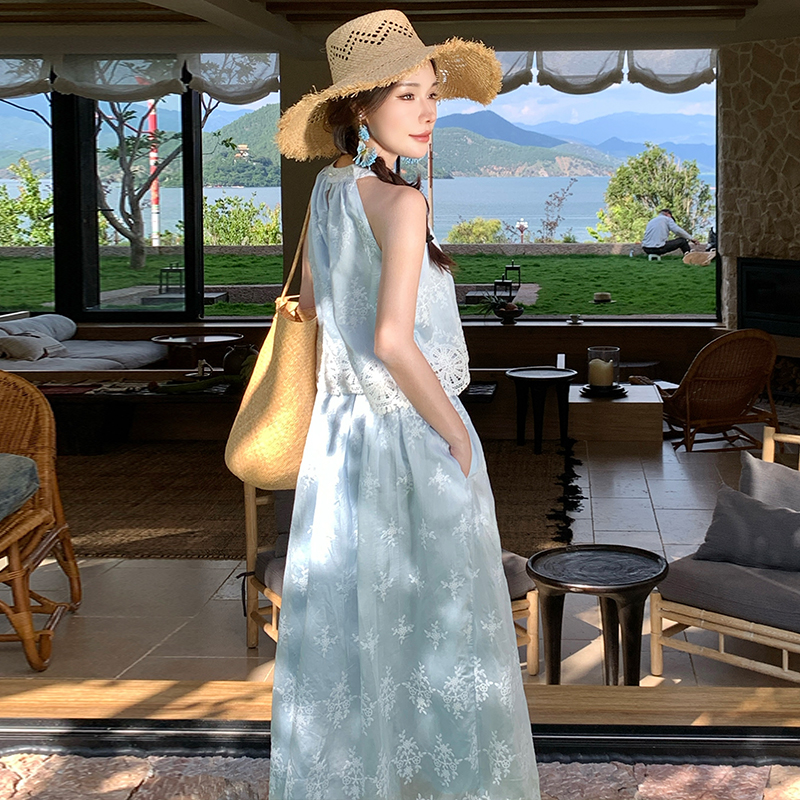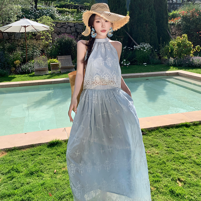 BY13074# 温柔风蕾丝刺绣挂脖马甲上衣高腰A摆法式半身裙两件套 服裝批發女裝批發服飾貨源