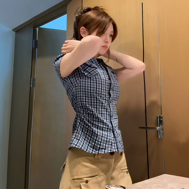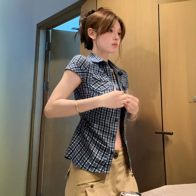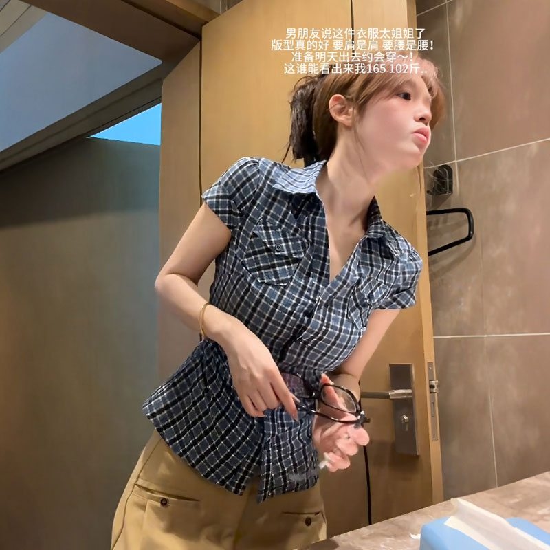 BY13288# 原版面料美式复古撞色格子短袖衬衫夏季修身显瘦百搭上衣 服裝批發女裝批發服飾貨源