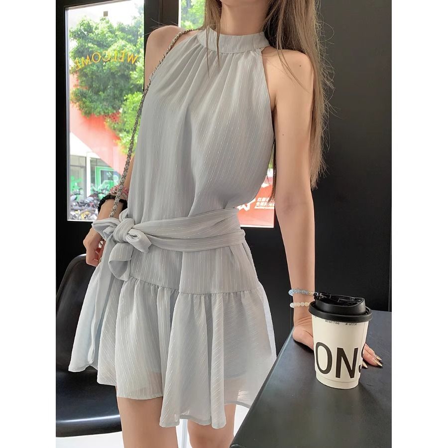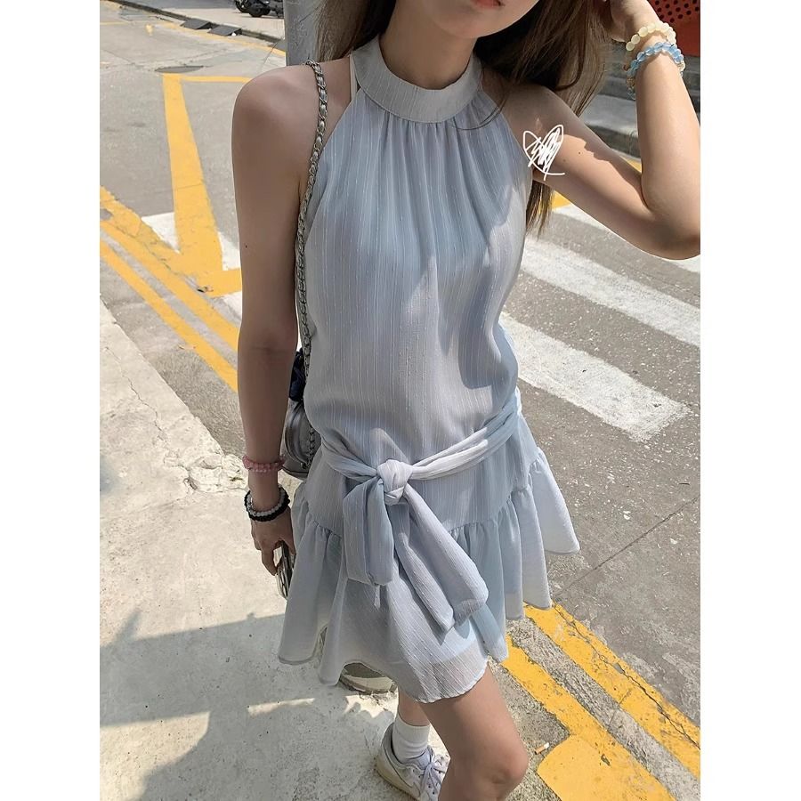 BY13328# 法式挂脖无袖蓝色连衣裙女装夏季设计感蝴蝶结绑带A字裙黑色短裙 服裝批發女裝批發服飾貨源