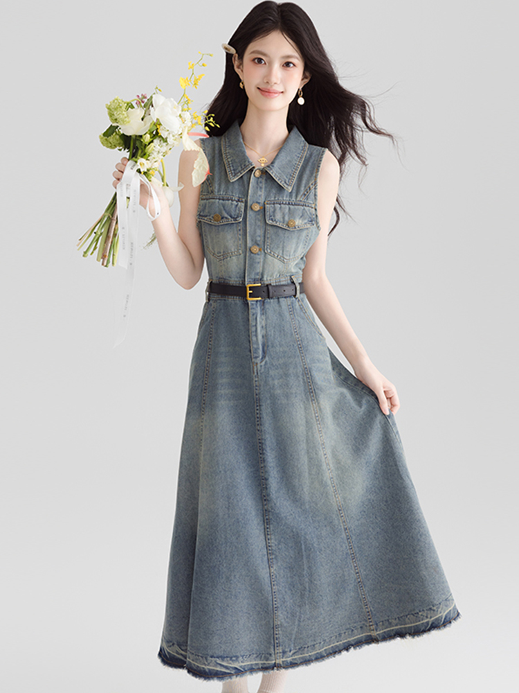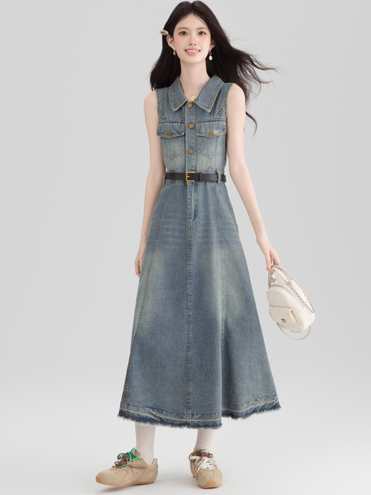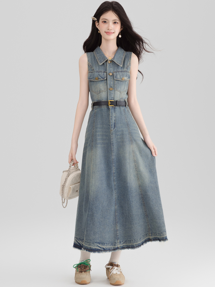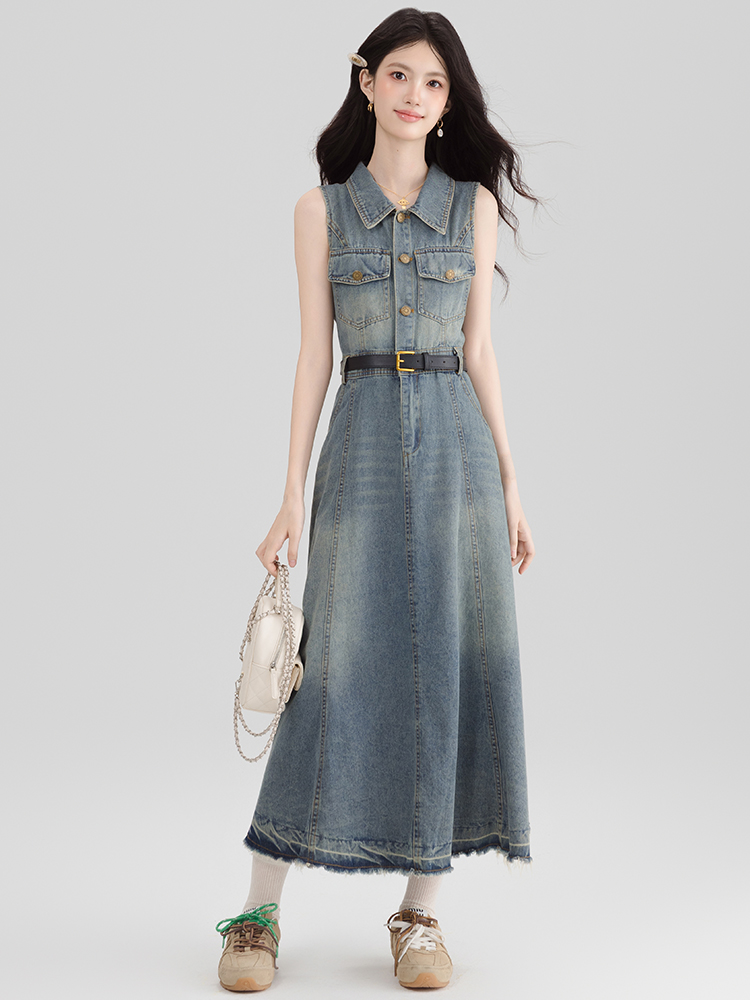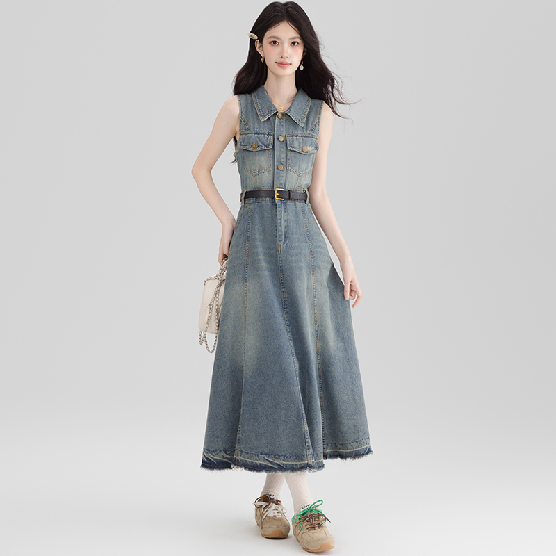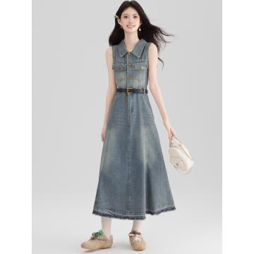 BY13365# 港风复古挂脖牛仔连衣裙女夏季独特气质露肩无袖长裙子显瘦 服裝批發女裝批發服飾貨源
