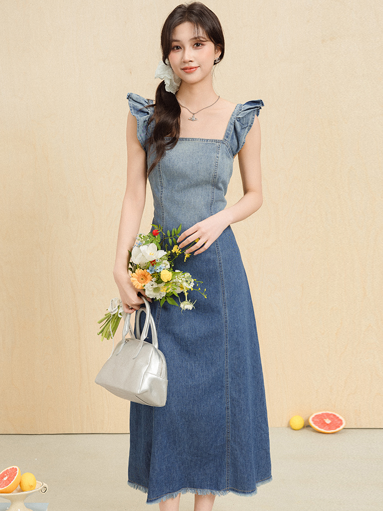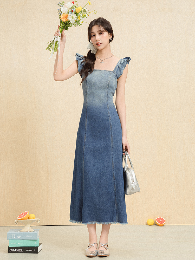 BY13366# 法式复古渐变牛仔连衣裙女夏季气质别致收腰开叉吊带长裙子 服裝批發女裝批發服飾貨源