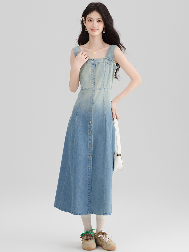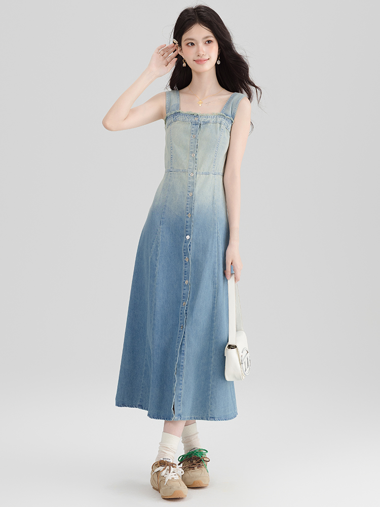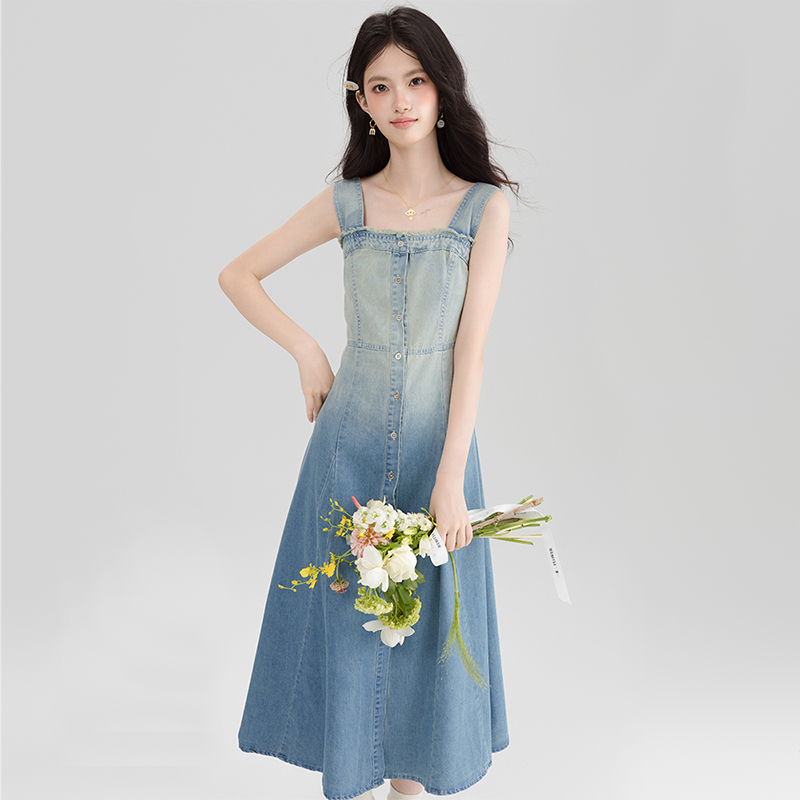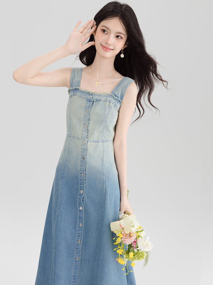 BY13369# 渐变色复古牛仔背心吊带连衣裙女夏气质收腰毛边大摆A字长裙 服裝批發女裝批發服飾貨源