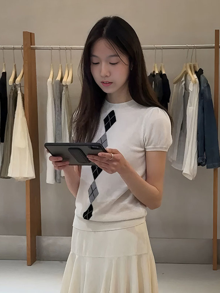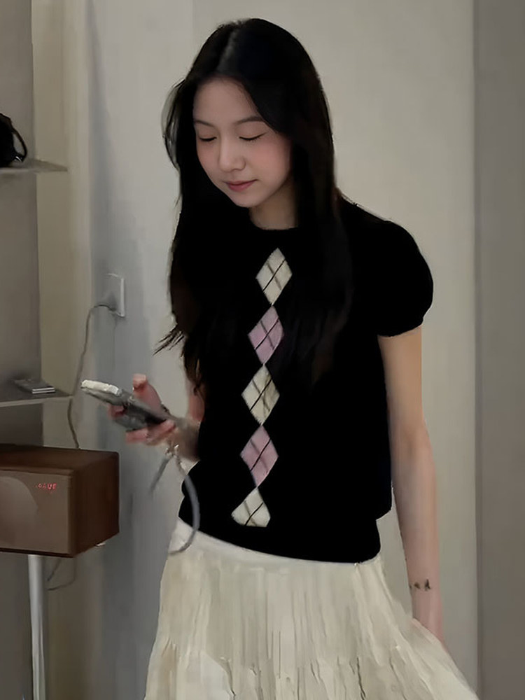 BY13383# 夏季新款韩系减龄百搭修身显瘦菱纹针织短袖t恤上衣女 服裝批發女裝批發服飾貨源
