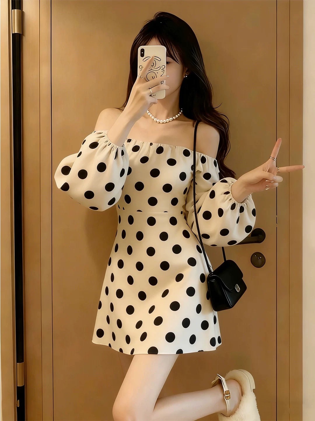 BY13408# 白色波点一字肩泡泡袖连衣裙女早春季新款温柔设计感气质短裙 服裝批發女裝批發服飾貨源