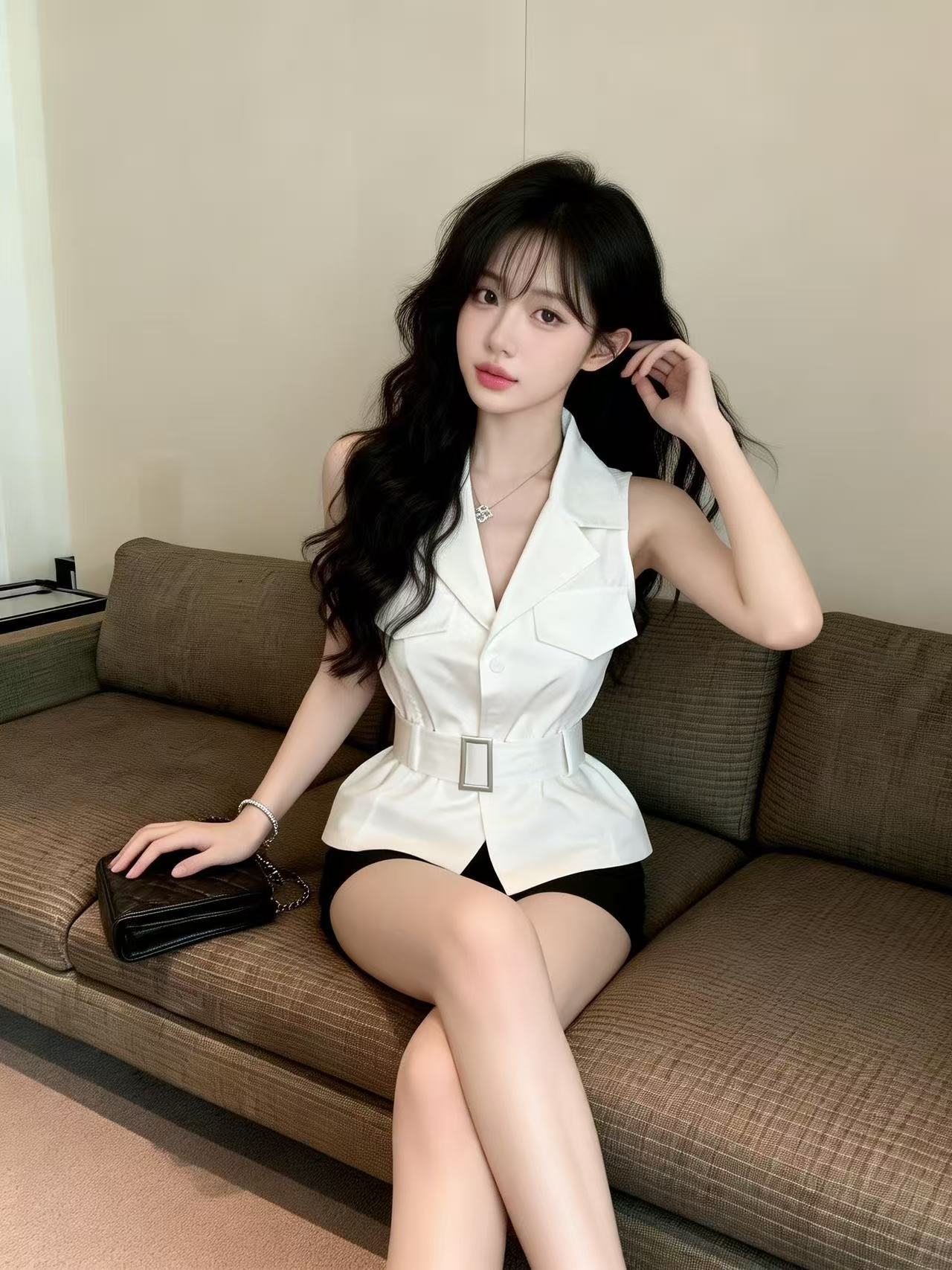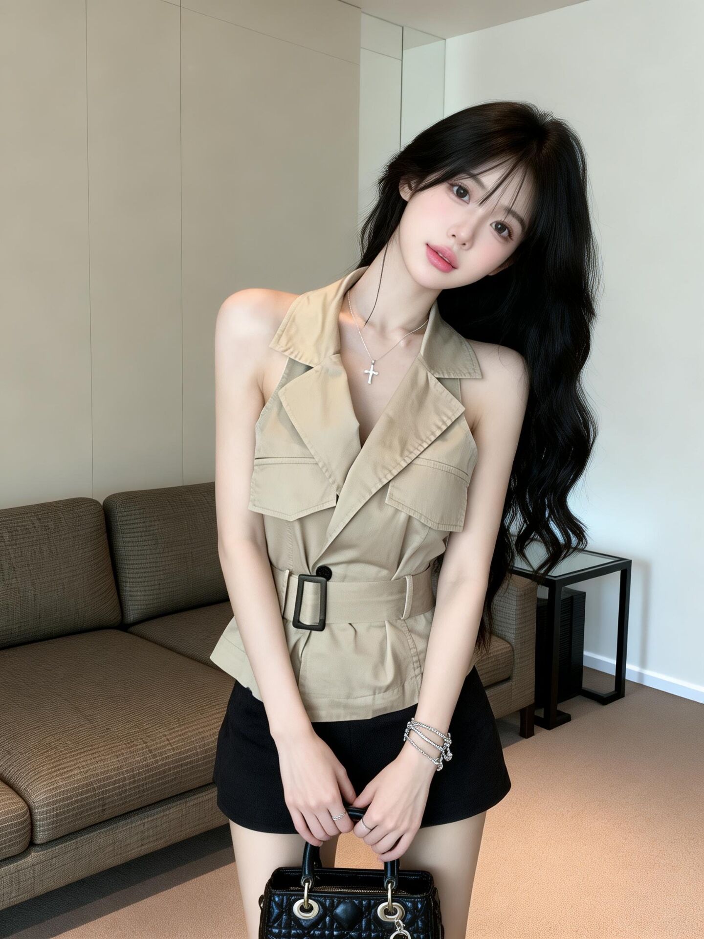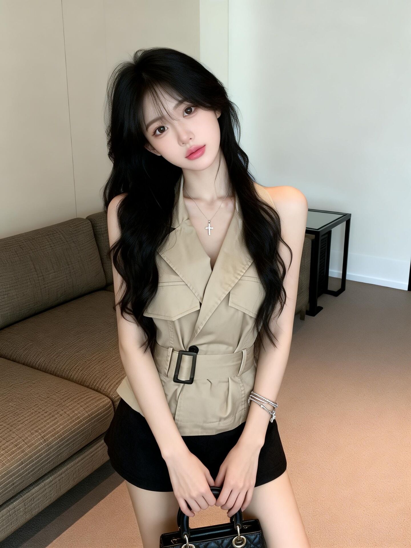 BY13456# 新款重工设计感双口袋盖饰POIO领显瘦马夹衬衣,配腰带 服裝批發女裝批發服飾貨源