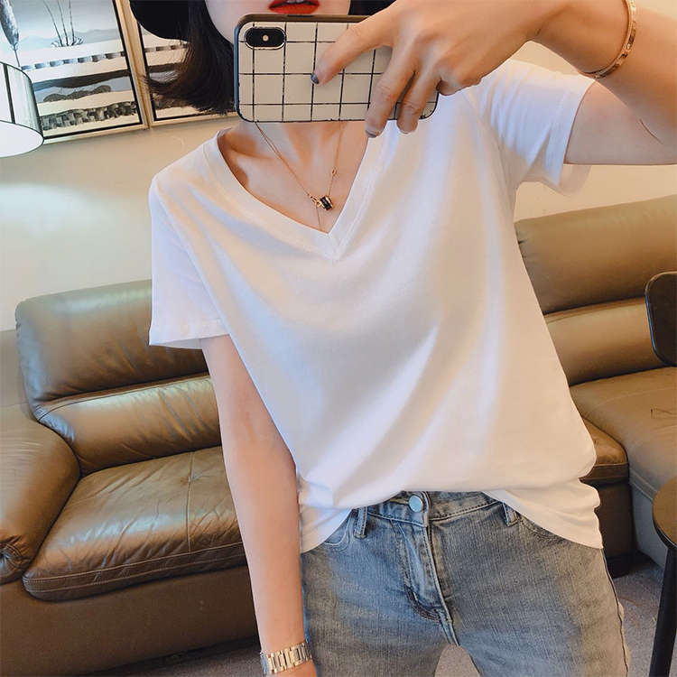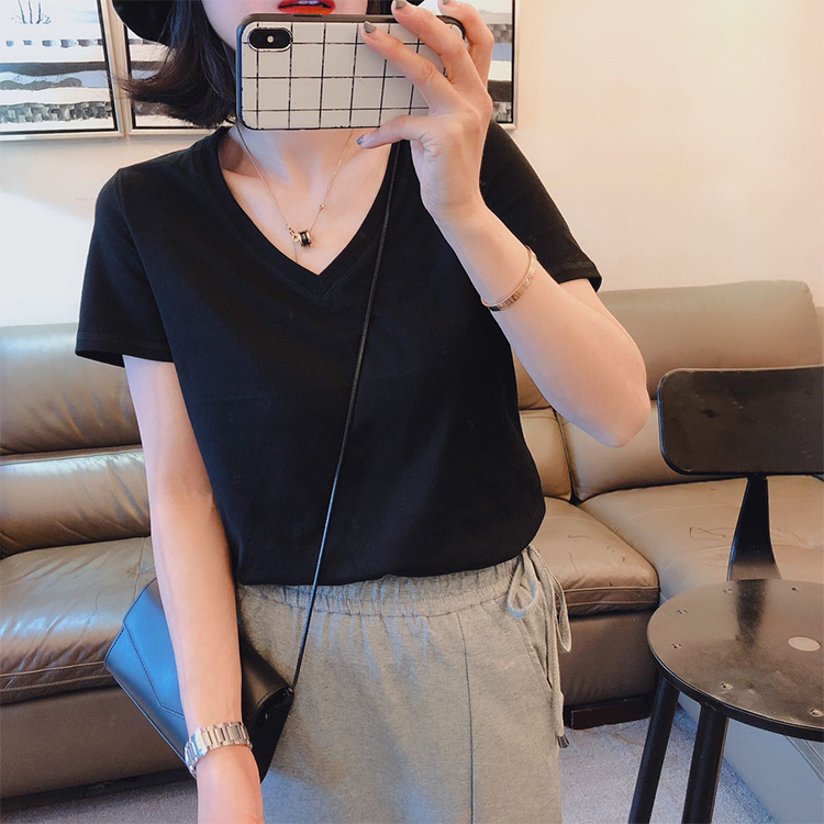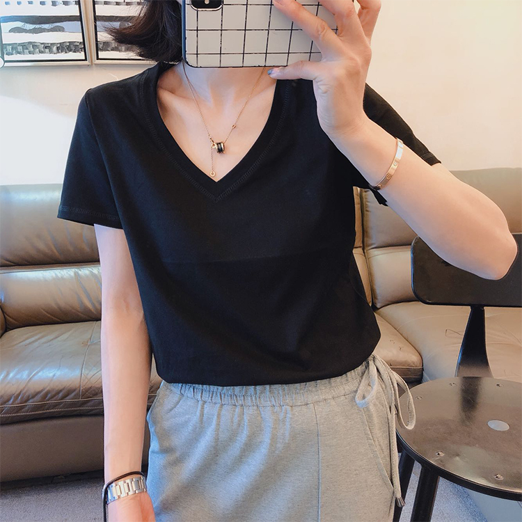 BY13499# 新款夏季V领短袖T恤女韩版休闲宽松正肩半袖时尚纯色百搭上衣 服裝批發女裝批發服飾貨源