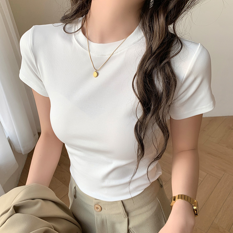 BY13505# 小个子正肩夏季短袖t恤女新款韩版纯色半袖紧身圆领软糯上衣 服裝批發女裝批發服飾貨源