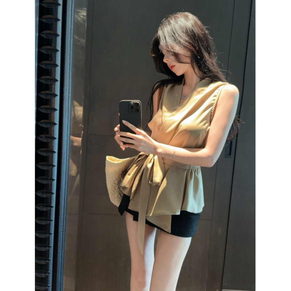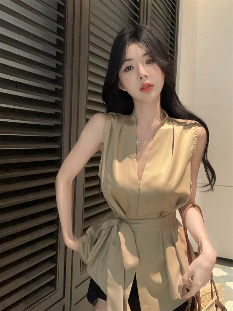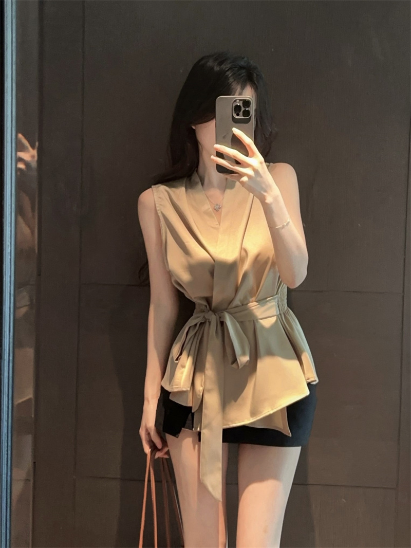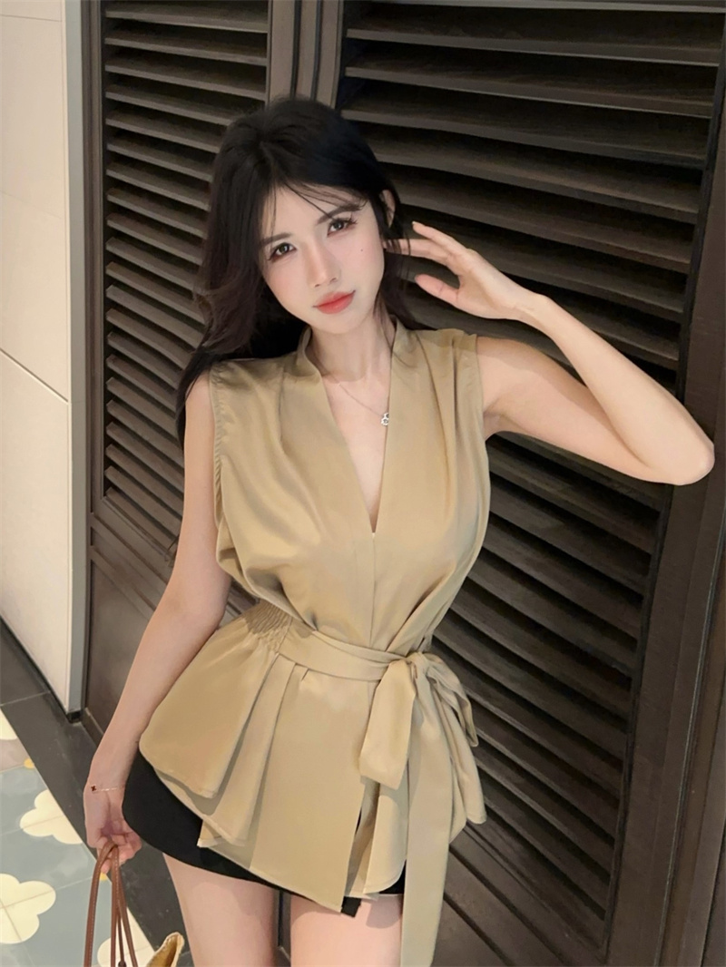 卡其色V领绑带收腰修身无袖气质衬衫上衣 服裝批發女裝批發服飾貨源